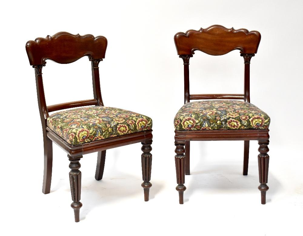 Lot 61 of 1231: A set of six Victorian mahogany bar back dining chairs with scroll decoration, overstuffed seats and reeded tapering legs (6).