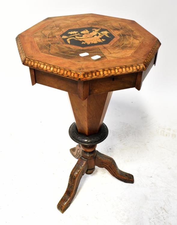 Lot 65 of 1231: A Victorian walnut octagonal top sewing table with fitted interior and tapering trumpet-form column, on tripod base, height 75cm.