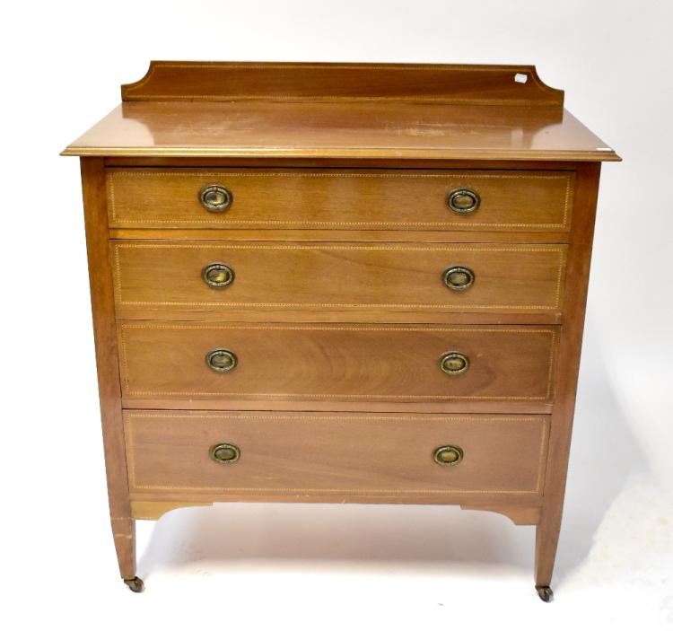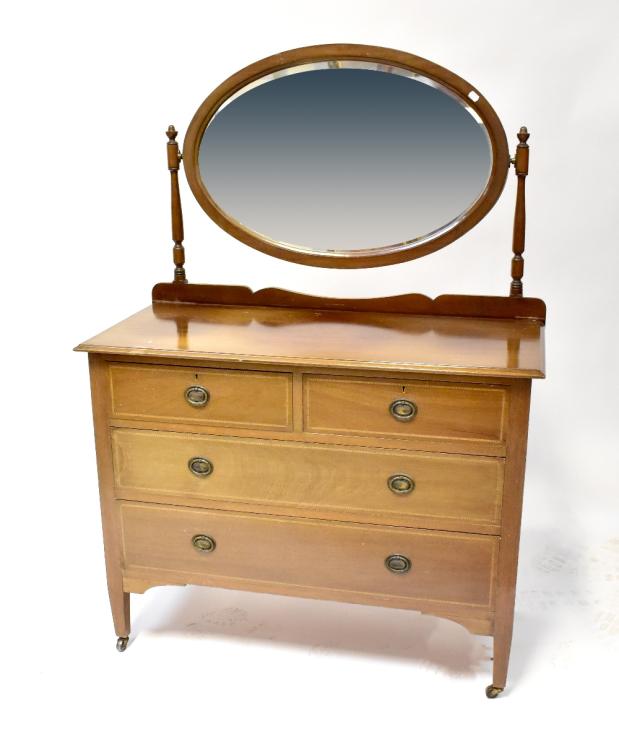 Lot 73 of 1231: An Edwardian mahogany dressing chest with oval bevelled mirror above two short and two long drawers, height 146cm, together with a matching chest of four tapering long drawers, both on square tapering legs and castors (2).
