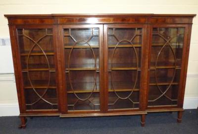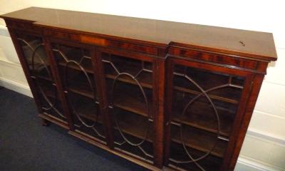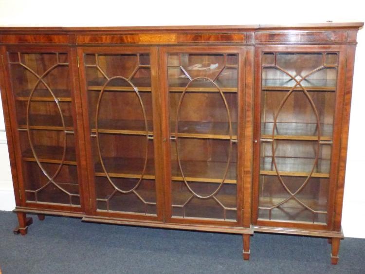 Lot 74 of 1231: An Edwardian-style mahogany breakfront bookcase, with four astragal glazed doors enclosing three banks of adjustable shelves, on tapered supports, 121 x 185 x 34cm.