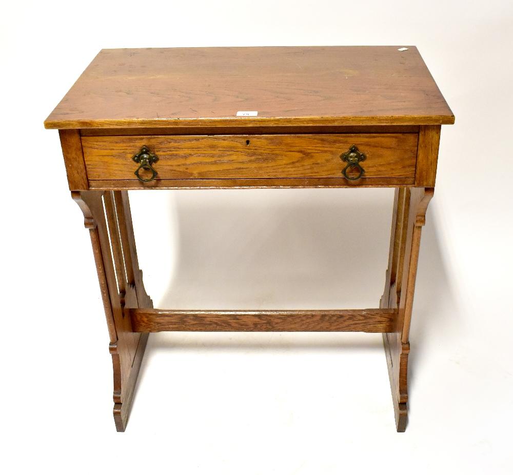 Lot 75 of 1231: An oak single-drawer side table with Gothic-style supports united by a stretcher, 84 x 76 x 45cm.