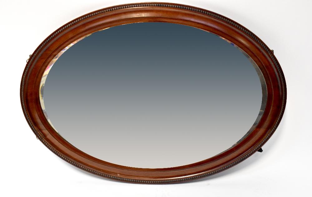 Lot 78 of 1231: A 1930s mahogany oval wall mirror with beaded border and bevelled glass, 73 x 102cm.