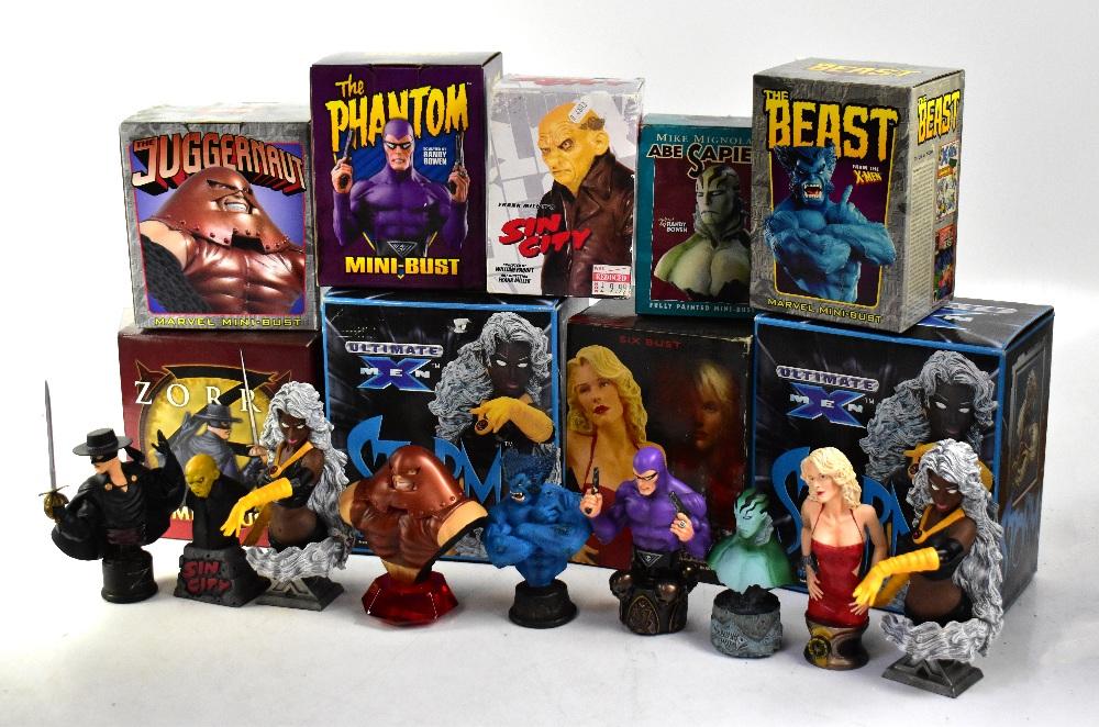 Lot 316 of 1231: X-MEN; two boxed Ultimate X-Men Ultimate Busts of 'Storm', a Marvel mini bust of 'The Beast' and a further example of 'The Juggernaut', also a mini bust of 'Abe Sapien', six from Battlestar Galactica, 'The Phantom', 'Zorro' and 'That Yellow Bastard from Frank Miller's Sin City', all in original boxes.