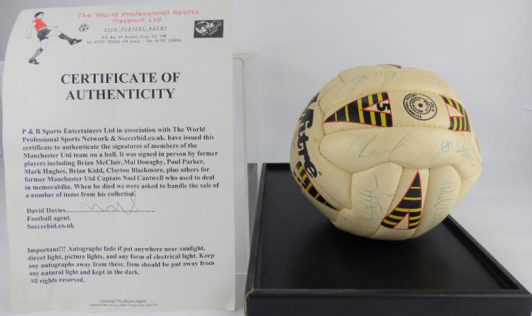 Lot 764 of 1231: MANCHESTER UNITED FC; a 1990/91 Mitre Delta Cosmic team signed football, with certificate of authenticity, in perspex and wooden based case.