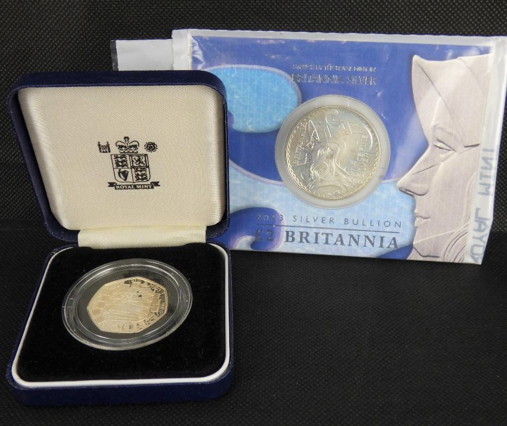 Lot 969 of 1231: A 2003 Britannia silver £2 coin in blister pack, together with a 1992-93 silver proof 50p coin, encapsulated, in presentation box with certificate (2).
