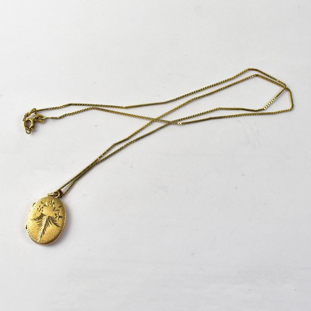 Lot 1062 of 1231: A 9ct gold oval double locket on a 9ct dainty chain, length 55cm, approx 7.7g.