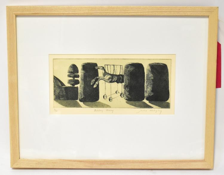 Lot 17 of 104: JULIA MIDGLEY; etching with aquatint, 'Holiday Diary', limited edition of ten, 29 x 40cm, framed.