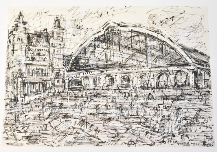 Lot 45 of 104: JEANETTE BARNES; pen and chalk, 'Outside Lime Street Station Liverpool', 30 x 41cm.