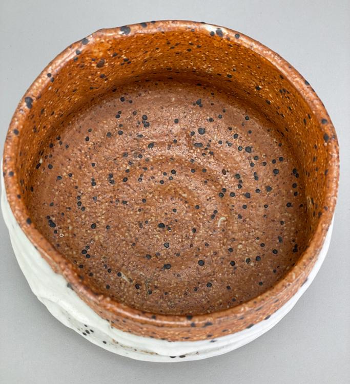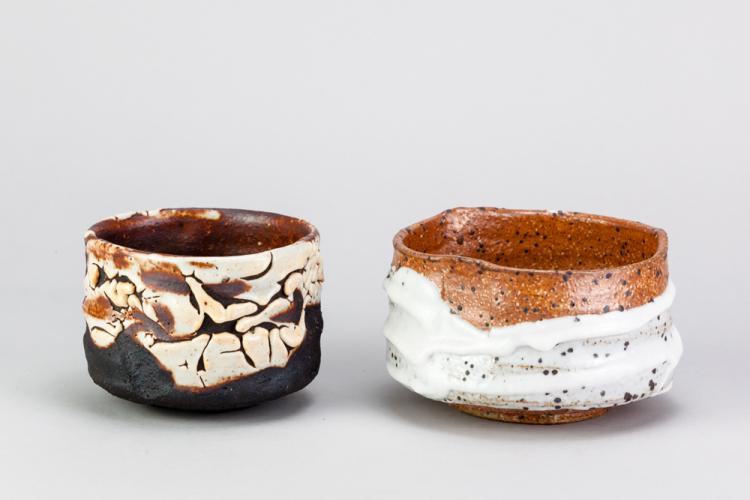 Lot 12 of 534: STEVE BOOTON (born 1957); a stoneware chawan partially covered in shino glaze, impressed SB mark, diameter 13cm, and a smaller example covered in black slip and crawling shino glaze (2). (D)