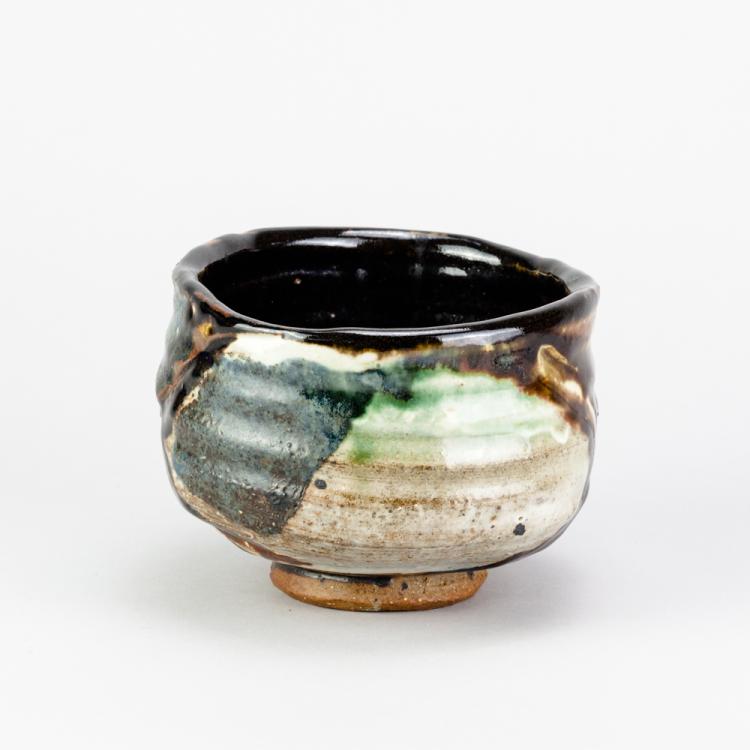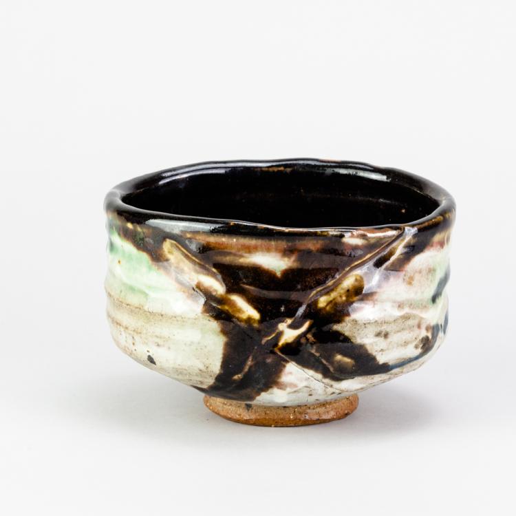 Lot 15 of 534: CHARLES BOUND (born 1939); a wood fired stoneware chawan partially covered in grey glaze with incised crosses picked out in tenmoku and cobalt glaze, diameter 14.5cm.  Provenance: Purchased from the artist, 1992. JB - From a sale at the kiln with lots of visitors including Bill Ismay and Maggie Barnes.