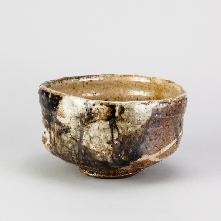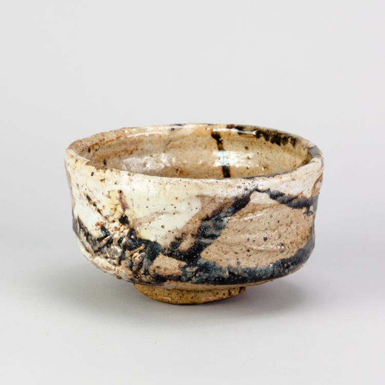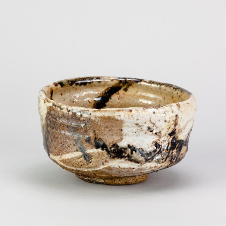Lot 16 of 534: CHARLES BOUND (born 1939); a wood fired stoneware chawan partially covered in white and tenmoku glaze, impressed mark, diameter 16.5cm.  Provenance: Purchased from the artist, 1991.