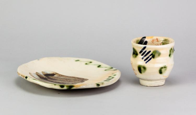 Lot 33 of 534: SANDY BROWN (born 1946); a stoneware plate covered in polychrome glaze, painted signature, diameter 21.5cm, and a matching yunomi, height 9cm (2). (D)