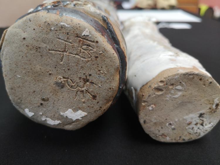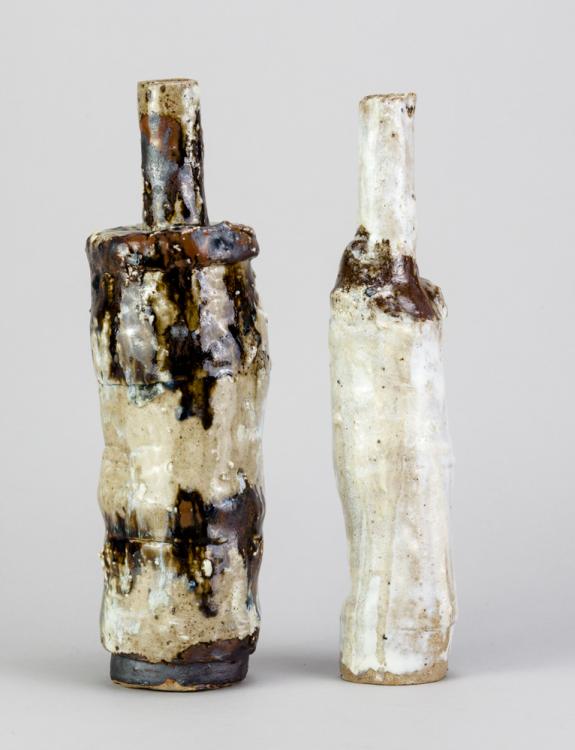 Lot 35 of 534: TERRENCE BUNCE; a stoneware bottle covered in white and tenmoku glaze, incised TB mark, height 27.5cm, and a smaller example (2). (D)