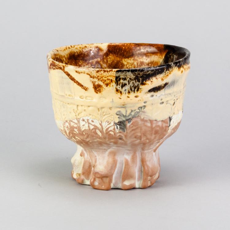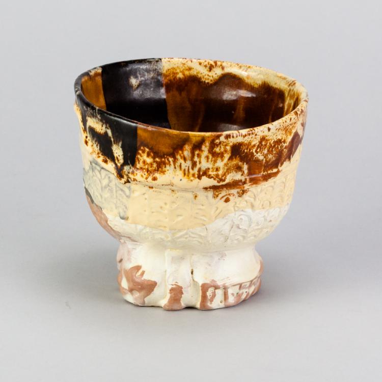 Lot 40 of 534: SIMON CARROLL (1964-2009); an earthenware teabowl covered in coloured slips and glazes with impressed decoration, painted SC mark dated 2005, height 10.5cm. (D)