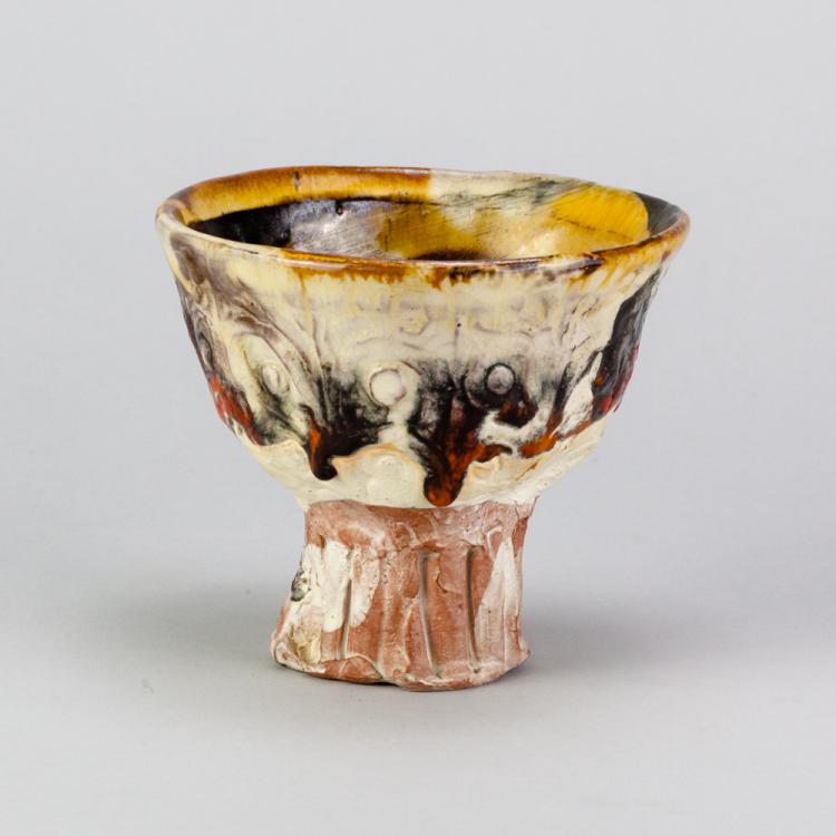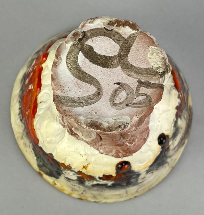 Lot 41 of 534: SIMON CARROLL (1964-2009); an earthenware teabowl covered in coloured slips and glazes with impressed decoration, painted SC mark dated 2005, height 10cm. (D)