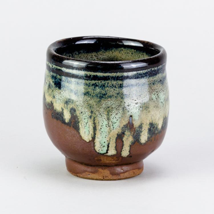 Lot 49 of 534: TREVOR CORSER (1938-2015) for Leach Pottery; a stoneware yunomi covered in tenmoku, kaki and nuka glaze, impressed TC and pottery marks, height 10cm. (D)