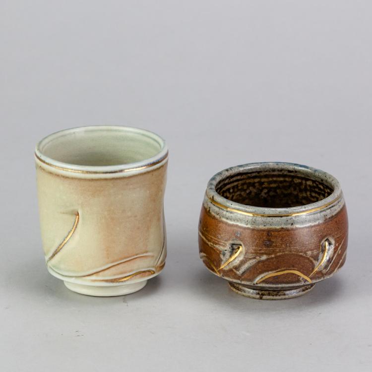 Lot 266 of 534: SUZY ATKINS for Poterie du Don; a porcelain cup covered in celadon glaze with pinkish hues with incised decoration picked out in gold lustre, incised signature, height 6.5cm, and a salt glazed cup with similar decoration (2).