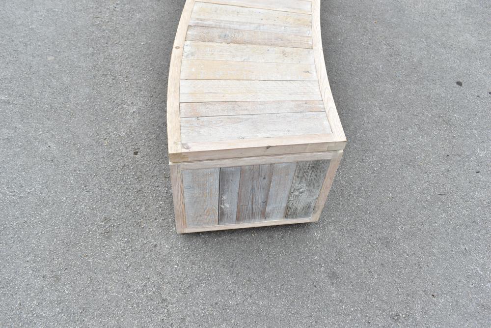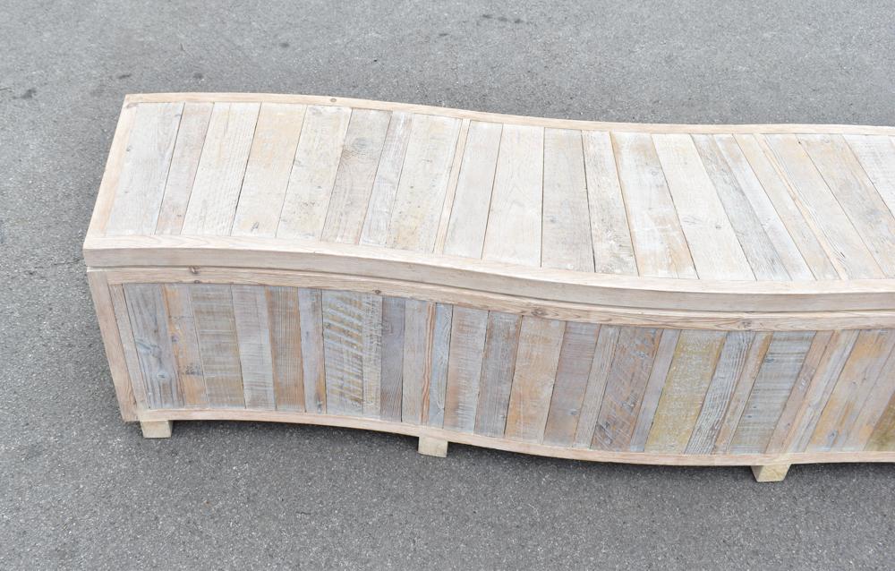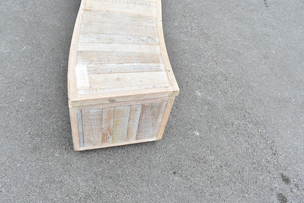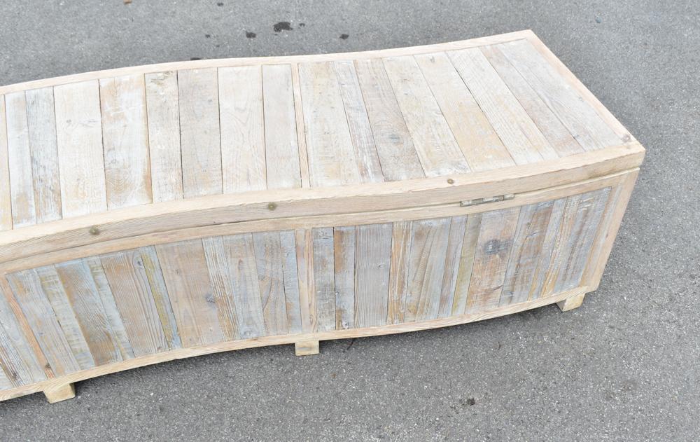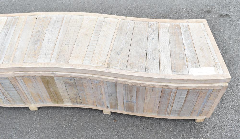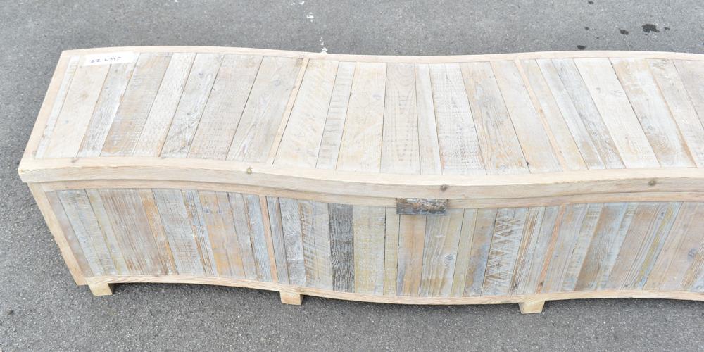 Lot 521 of 534: EDWARD TEASDALE (born 1945); a large wavy chest made of planked panels of reclaimed lime-washed wood on block feet with hinged lid, 232 x 45.5 x 46cm. (D) Provenance: Purchased from the Craft Centre and Design Gallery, Leeds. JB - I am drawn to the combination of a simple hand-made aesthetic allied to the ecological principles of the maker's practice. The outstanding design feature of this particular box, which so enhances its strong, simply stated presence, is its wave form: that of a stret