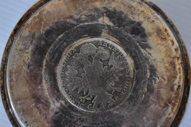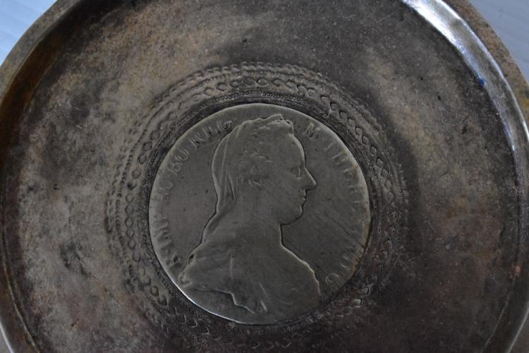 Lot 21 of 616: T H HAZLEWOOD & CO; a George V hallmarked silver inkwell of hexagonal form with hinged cover and integrated glass liner, Birmingham 1920, and a pair of white metal sugar tongs and a white metal dish inset with an old Maria Theresa Thaler coin (3).