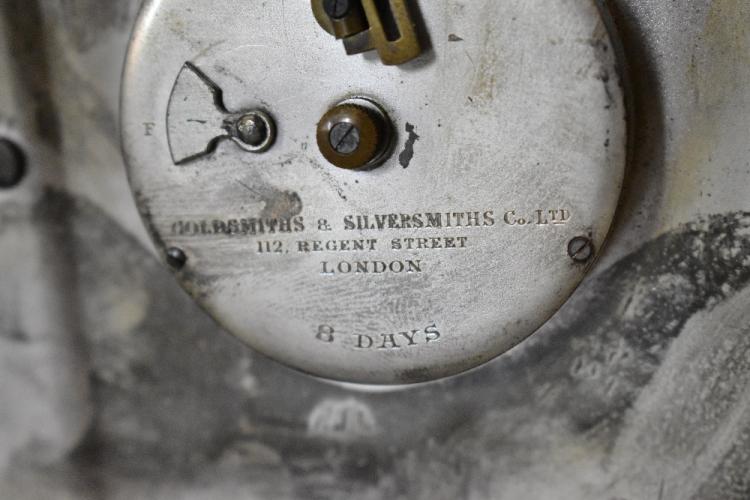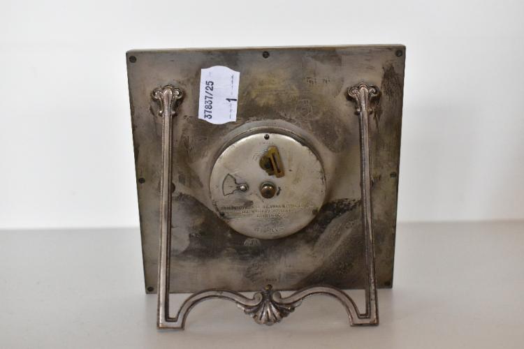 Lot 25 of 616: GOLDSMITHS & SILVERSMITHS 112 REGENT STREET, LONDON; a silver plated easel back desk clock, the square face set with a silver chapter dial bearing Roman numerals with eight day movement, 11.5 x 11.5cm.