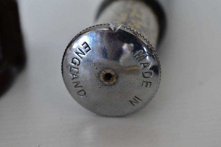 Lot 29 of 616: An Otis King pocket calculator, height 26cm, and a 19th century ceramic inkwell, a 'Chemico' French Chalk sprinkler tin, also two fountain pens including two Sheaffer examples, one with 14K nib (5).
