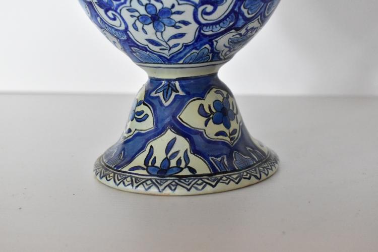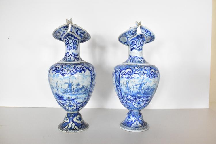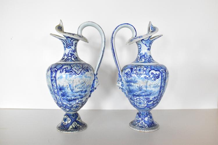 Lot 39 of 616: A pair of 19th century Dutch Delft flagons with folded rims, decorated in panels depicting sailing vessels and windmills inside scrolling detail, height 37cm (2).