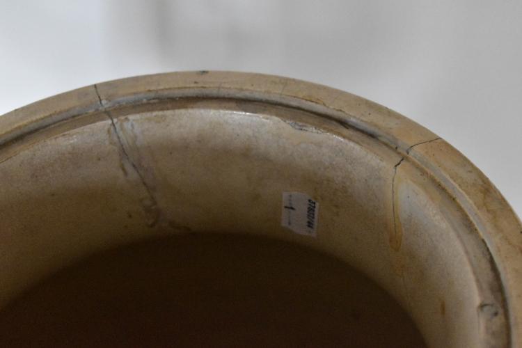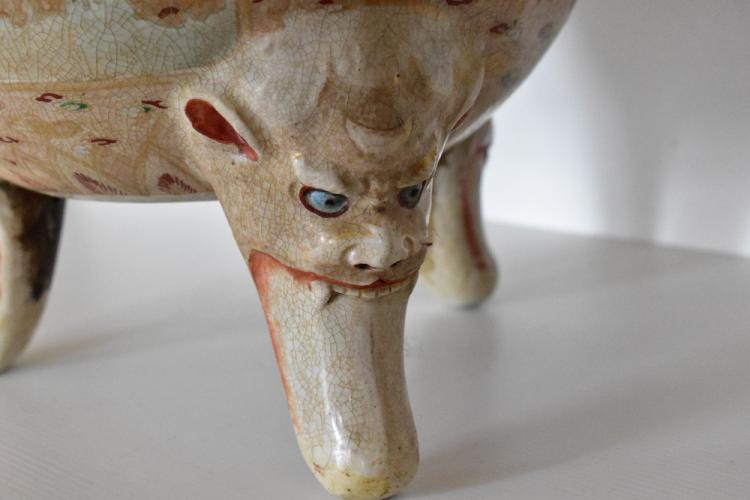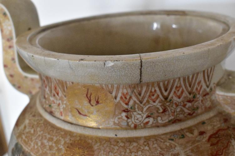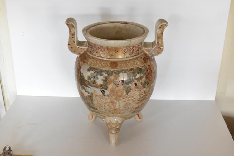 Lot 44 of 616: A large Japanese Satsuma twin handled koro, decorated with warriors in a landscape setting, raised on three mask head feet, height 47cm (af).