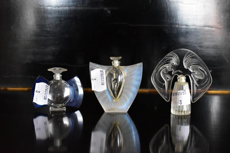 Lot 50 of 616: LALIQUE; three contemporary clear glass and plastic perfume bottles (3).