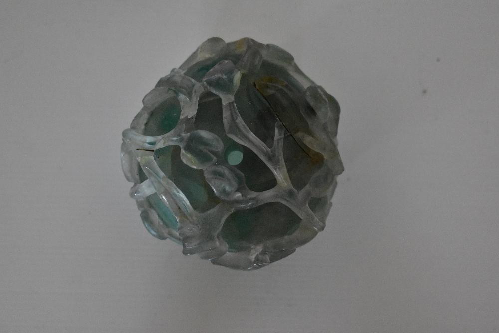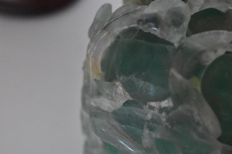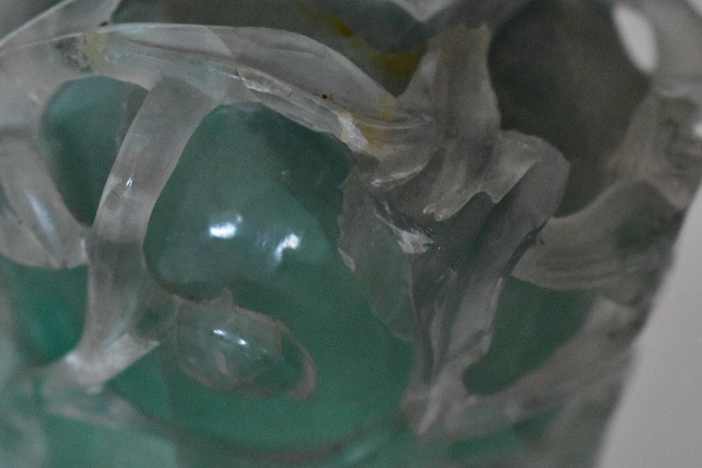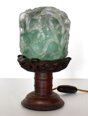 Lot 52 of 616: A 20th century Chinese jade style glass shade on turned wooden stand with floral decoration, height 20cm, and a similar jar and cover on an associated wooden stand, height 31cm.