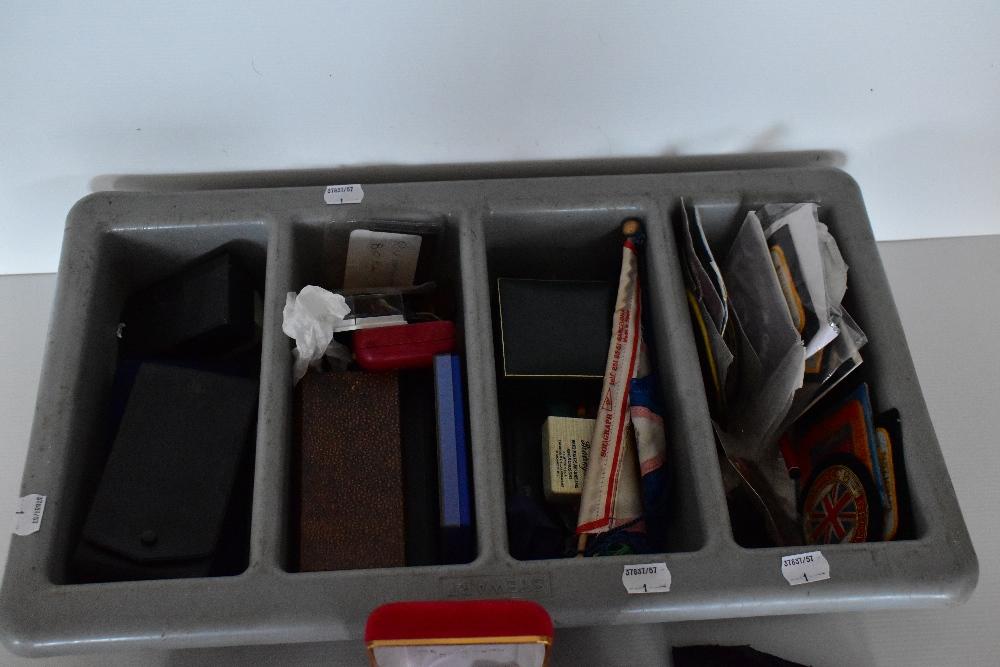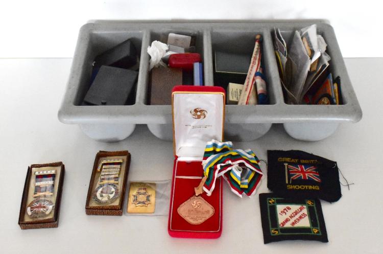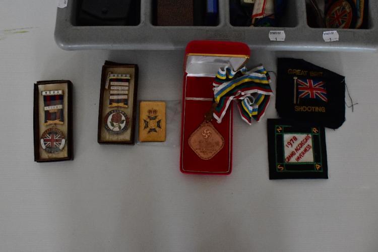Lot 56 of 616: A mixed lot of medals and badges, various examples including National Small Bore Rifle Association inscribed 'Bisley 1989', MSRA England International, various cloth badges etc.