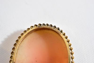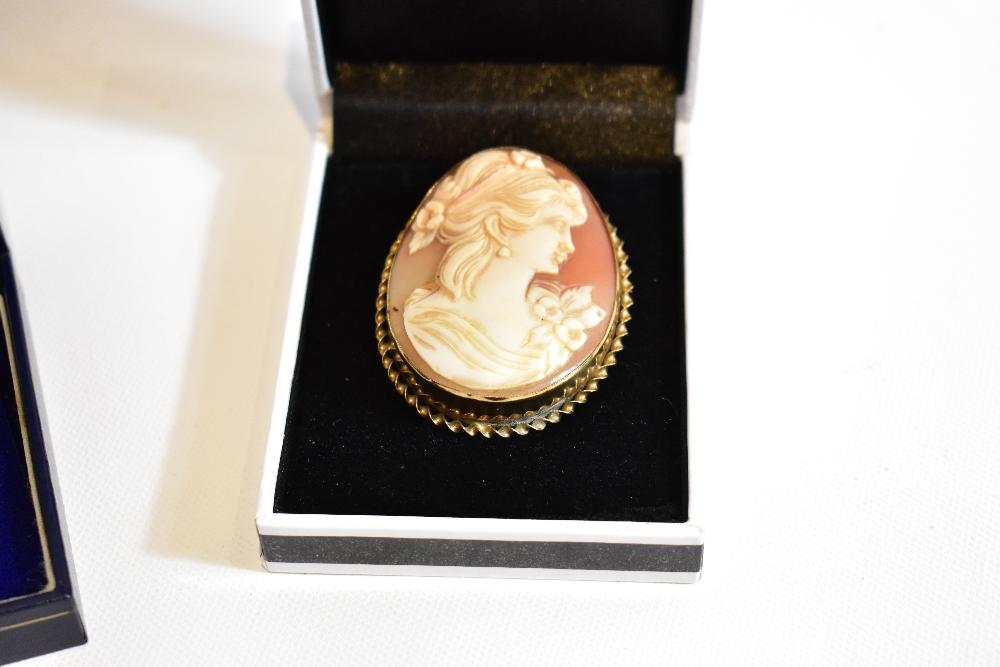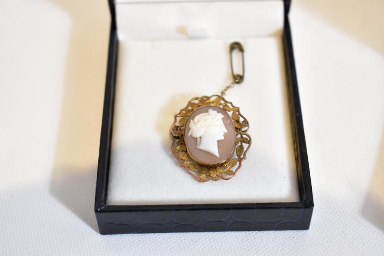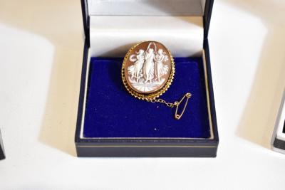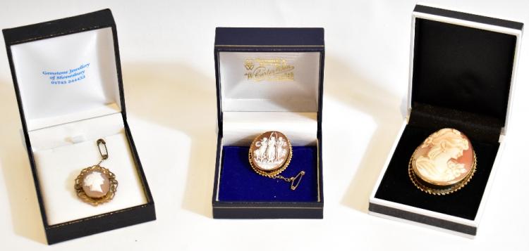 Lot 60 of 616: Three 9ct gold mounted cameo style brooches including an example of oval form decorated with the 'Three Graces', approx 3.5 x 2.5cm, a further example in the Victorian style with a side profile of a maiden with flowing hair (3).