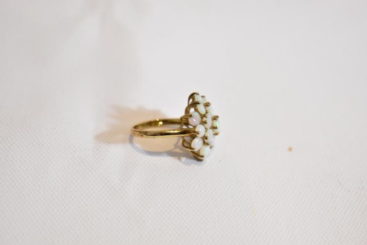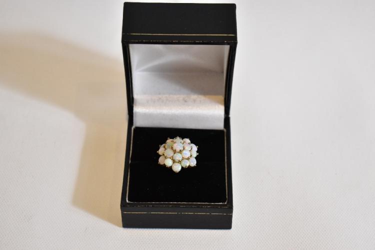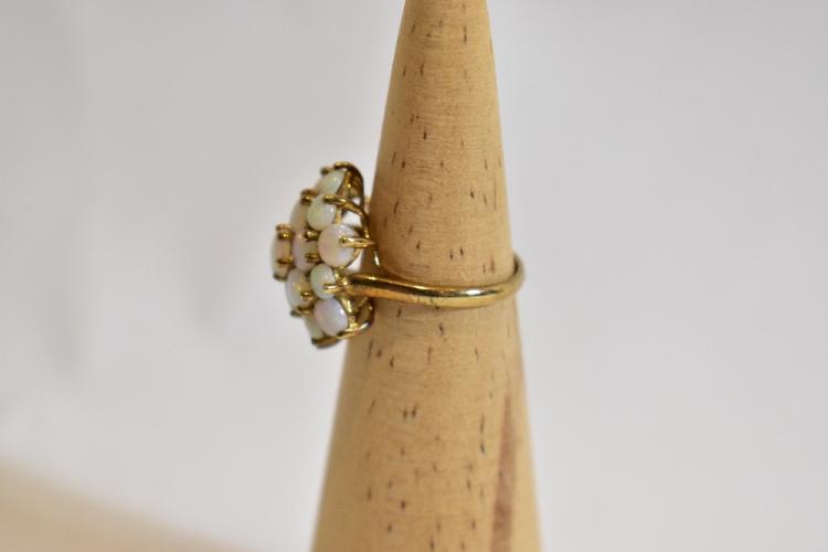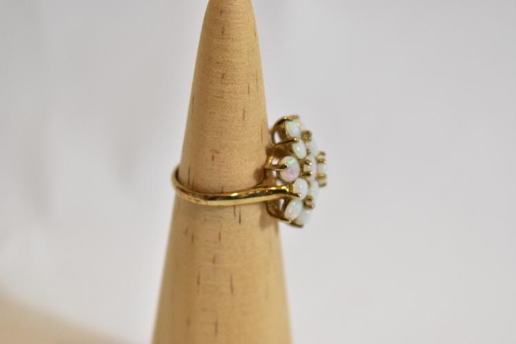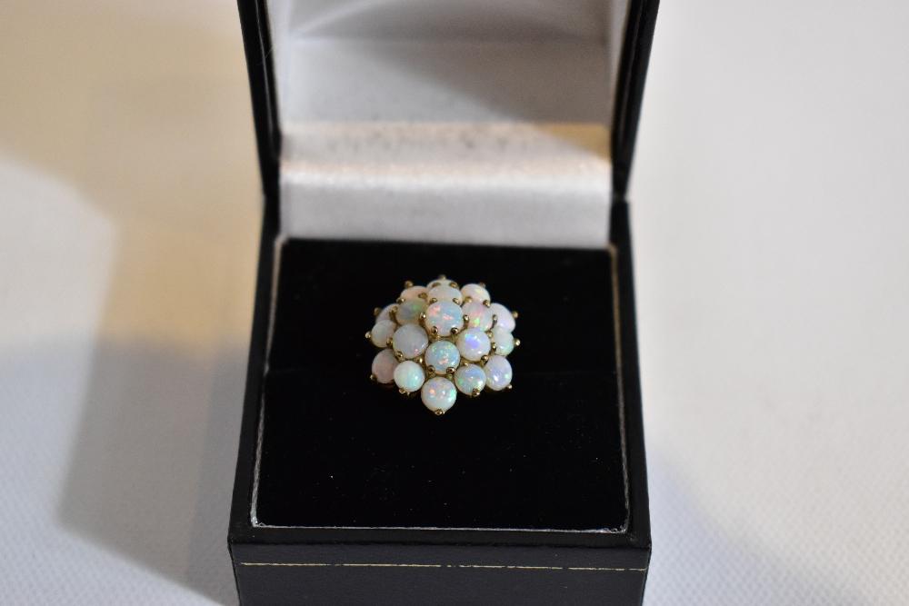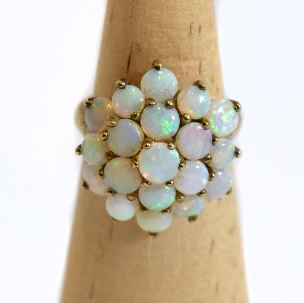 Lot 63 of 616: A 14ct yellow gold mounted opal floral cluster ring, size J, approx 3.1g.