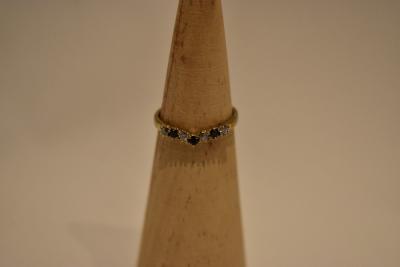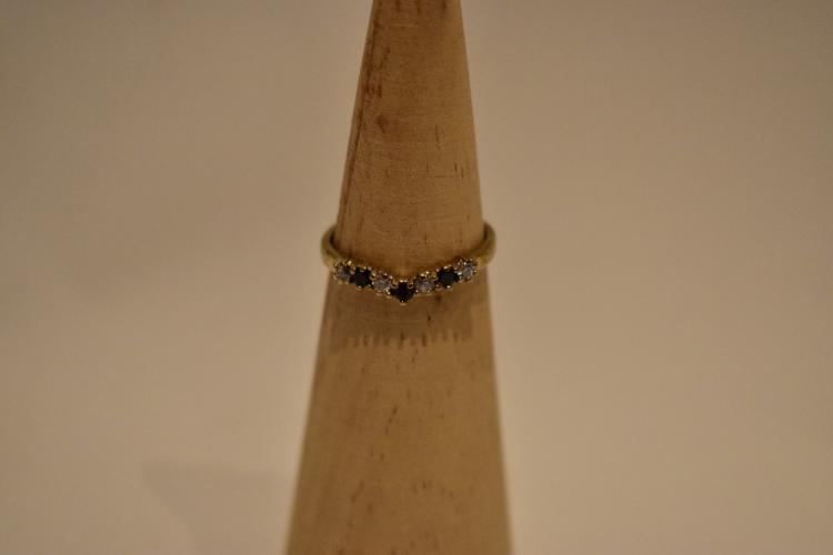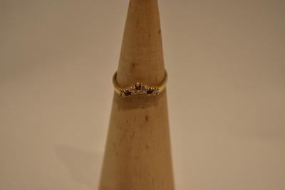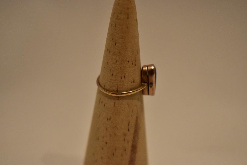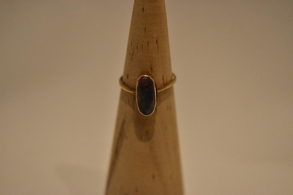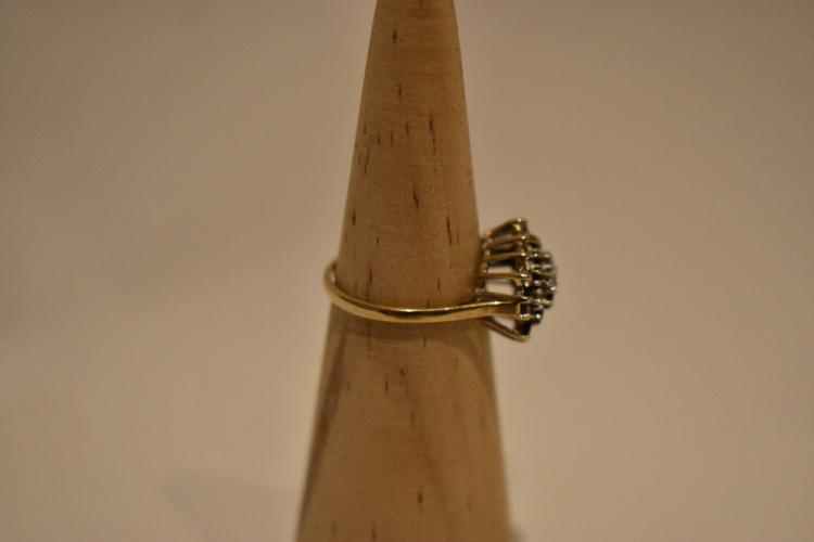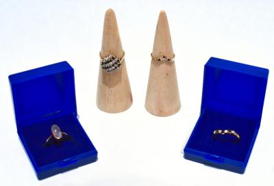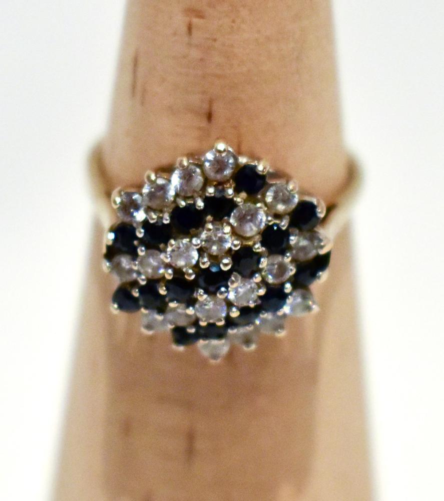 Lot 70 of 616: Three 9ct yellow gold mounted dress rings including a floral cluster example set with black and white coloured stones, size N, and a yellow metal mounted dress ring with oval shaped opal, combined approx 6.9g (4).