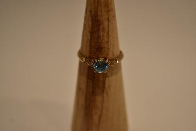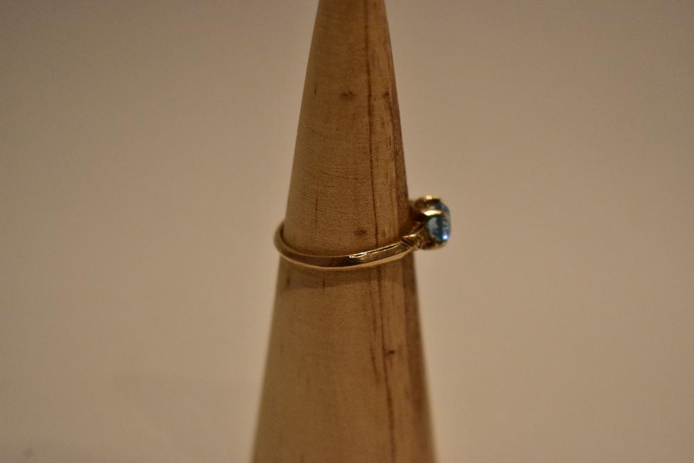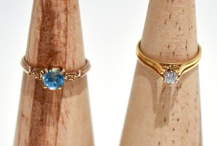 Lot 71 of 616: Two yellow metal dress rings including an example with central clear stone, stamped 750, size M, and a solitaire style ring with blue stone stamped 18k, combined approx 4.2g.
