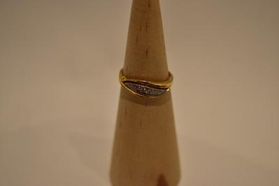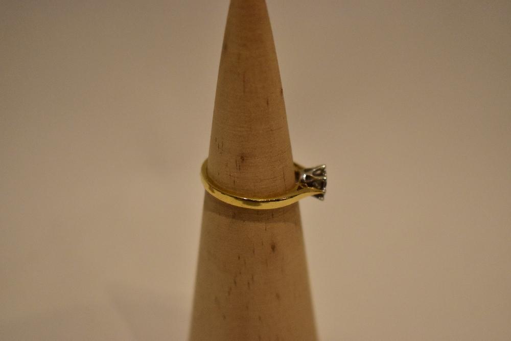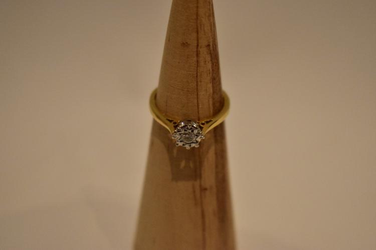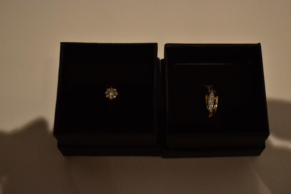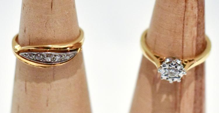 Lot 73 of 616: An 18ct yellow gold illusion set dress ring set with central diamond, size L 1/2, and a further 18ct yellow gold dress ring set with five clear stones, size M, combined 5.5g.