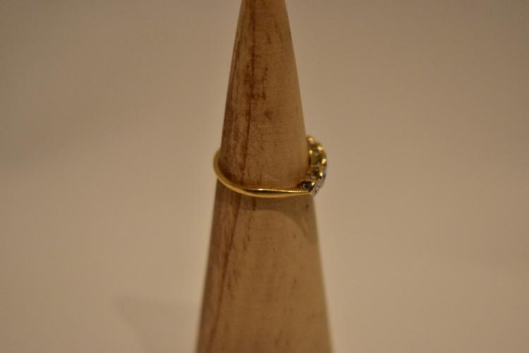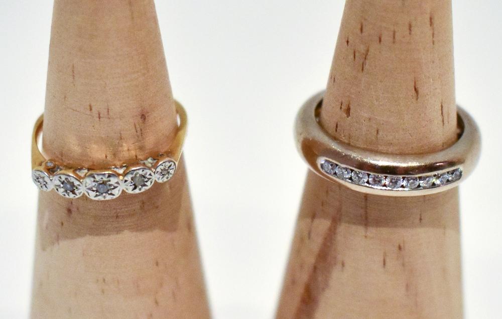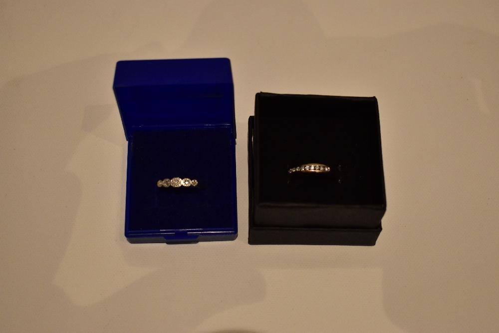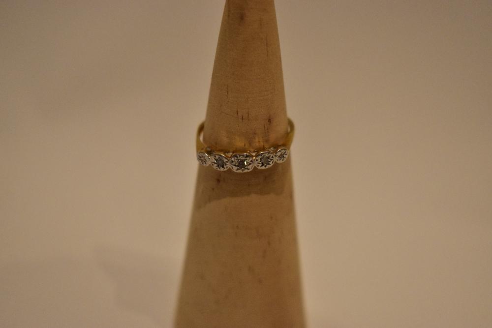 Lot 74 of 616: An 18ct yellow gold and platinum illusion set five stone dress ring, size J 1/2, and a white metal ring set with nine clear stones, stamped 750, size N, combined approx 8.3g (2).