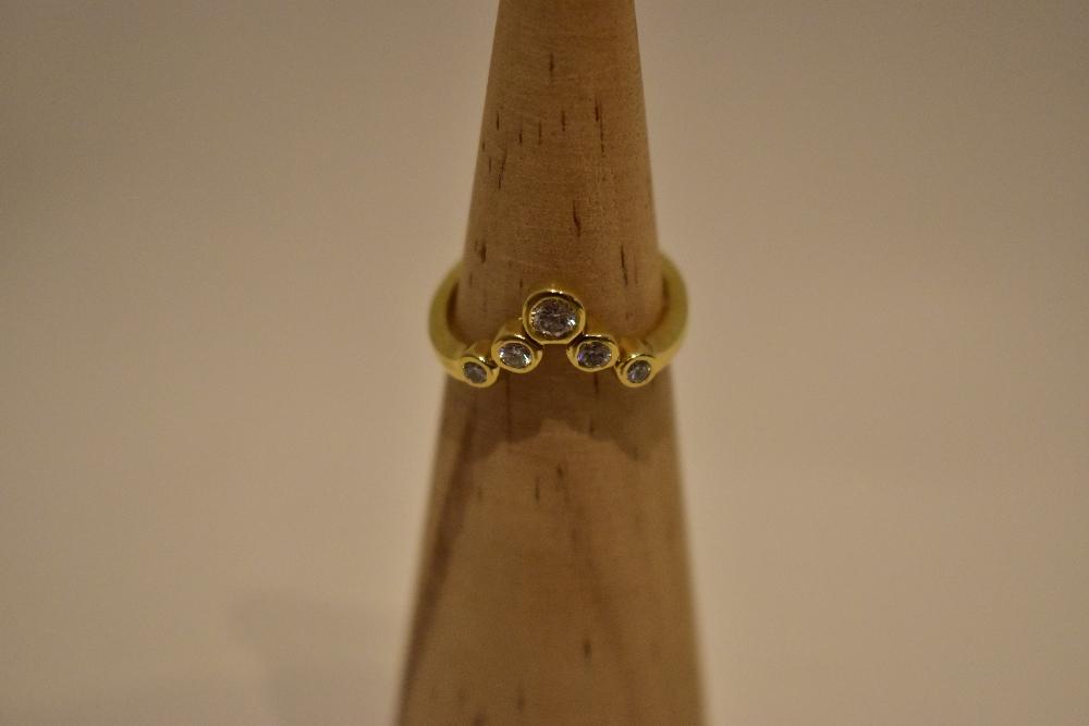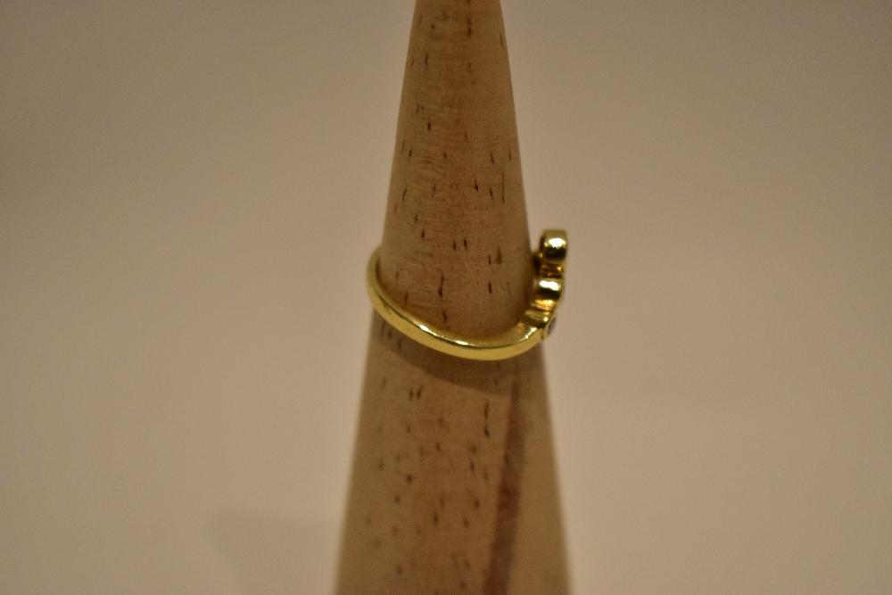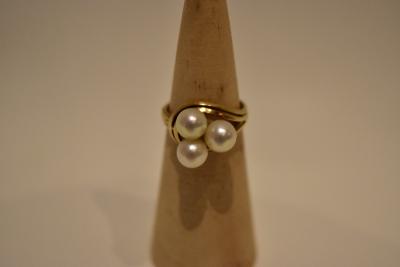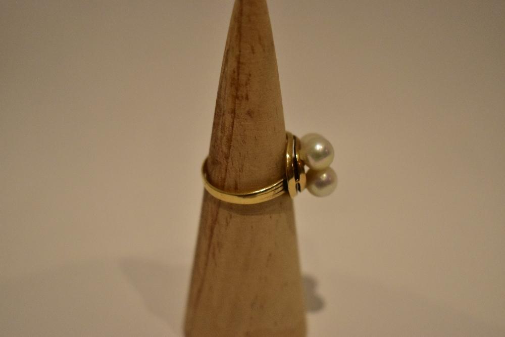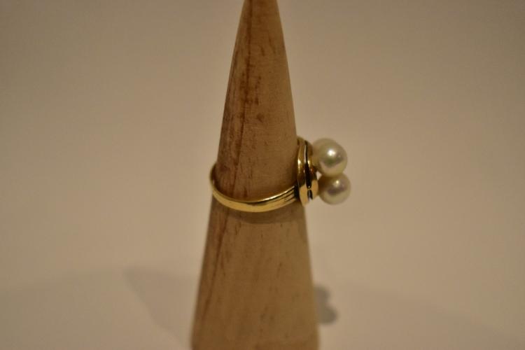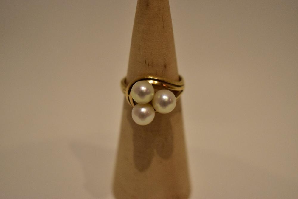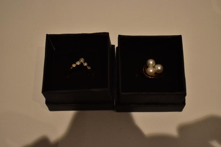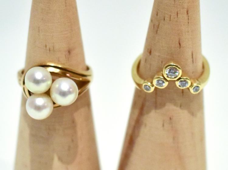 Lot 75 of 616: Two yellow metal dress rings comprising a V shaped example set with five clear stones, stamped 585, size L, and an example with three seed pearls, stamped K14, size N 1/2, combined approx 8.2g (2).