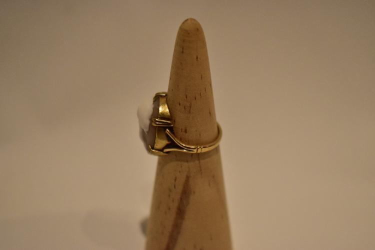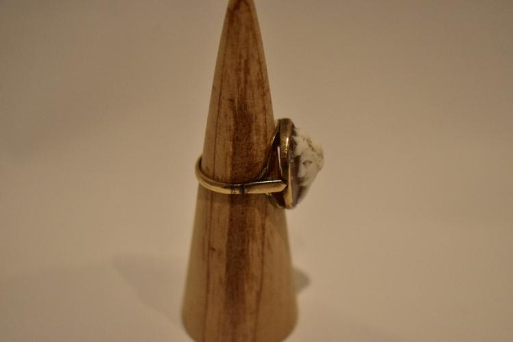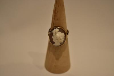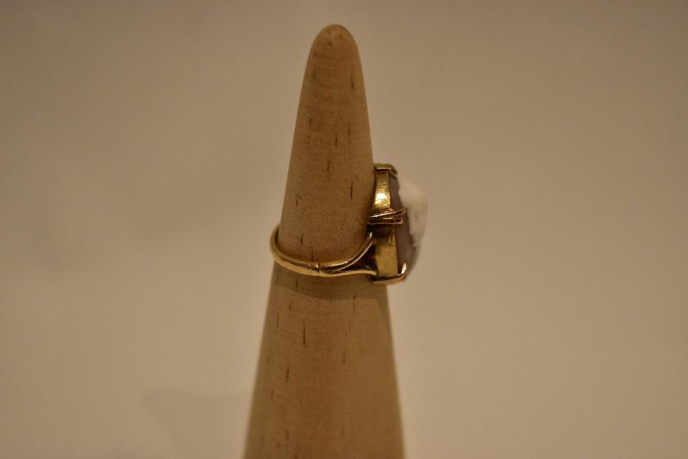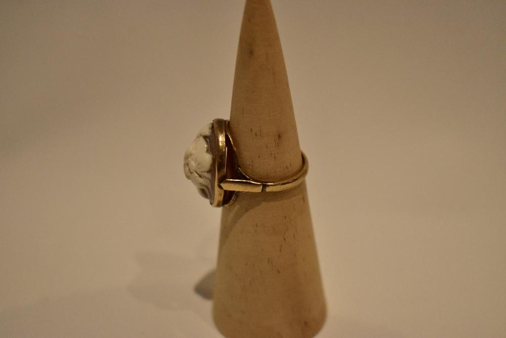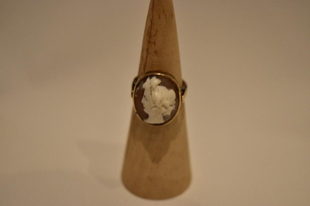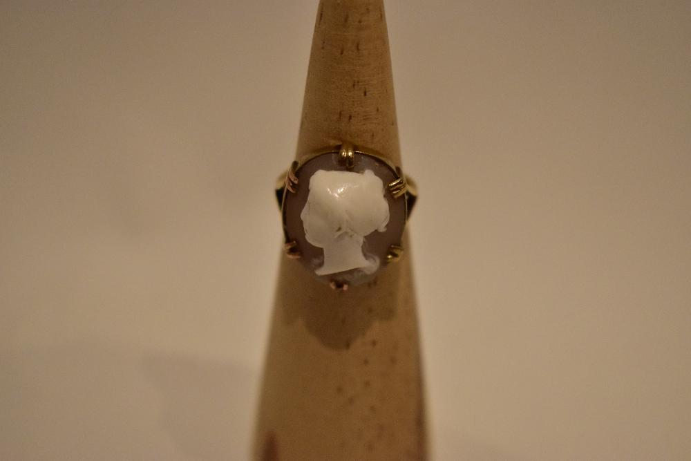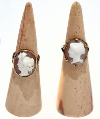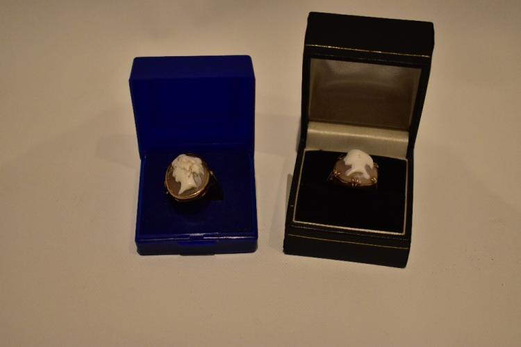 Lot 76 of 616: A 9ct yellow gold mounted cameo dress ring, set with side profile of a maiden with flowing hair, size N 1/2, and a yellow metal cameo set dress ring, size K 1/2, combined approx 9.3g (2).