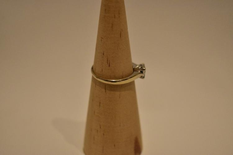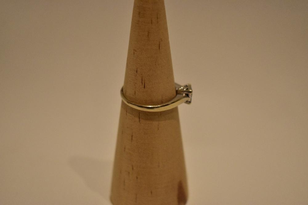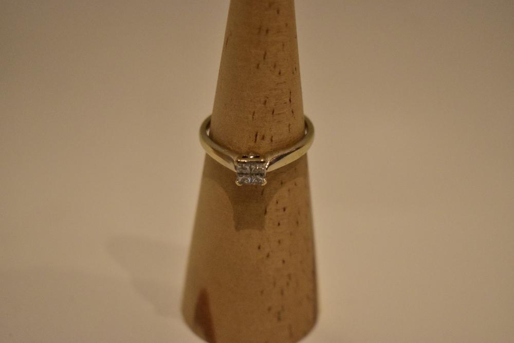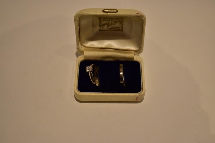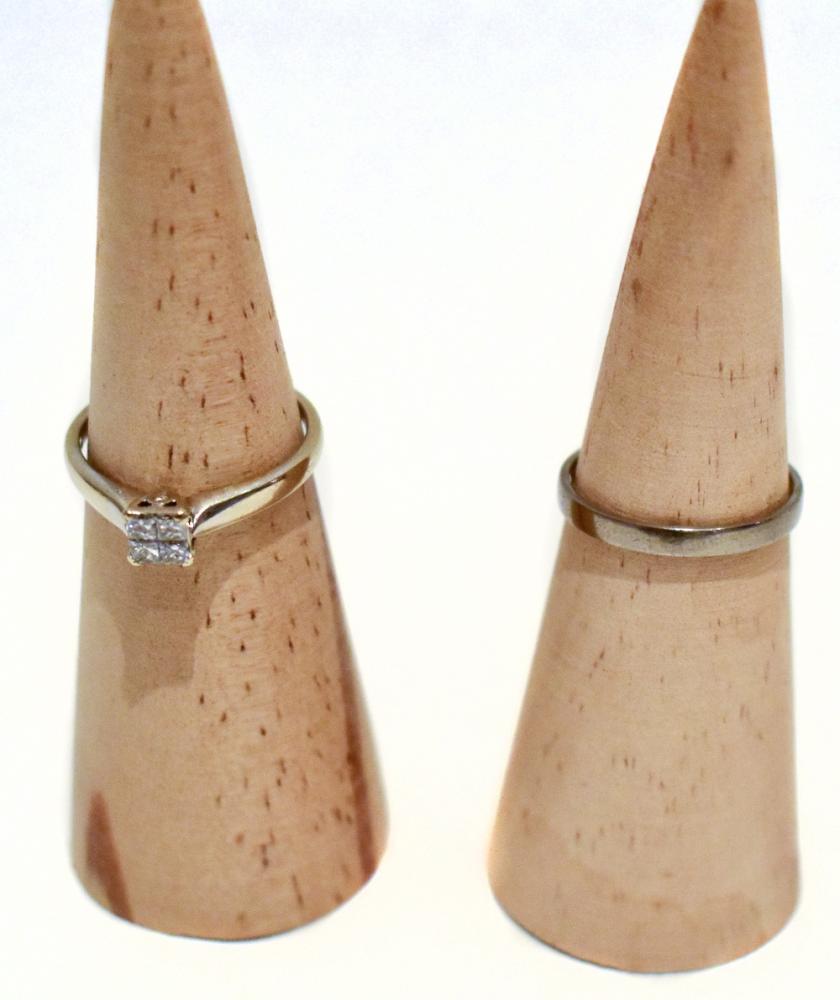 Lot 77 of 616: A white metal princess cut diamond ring, set with four stones, size Q, stamped 750, and a white metal wedding band, size P 1/2 and stamped 750, combined approx 5.7g.