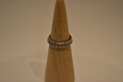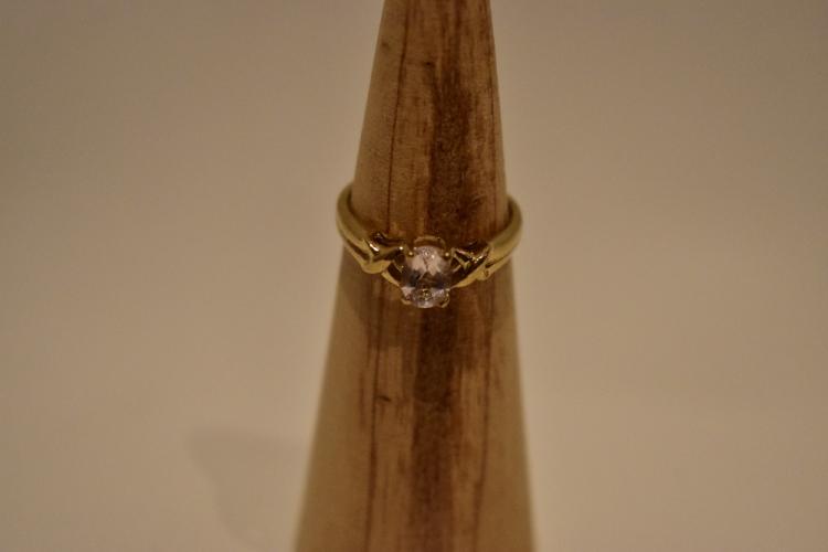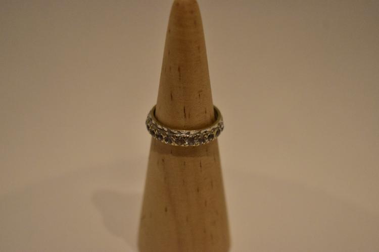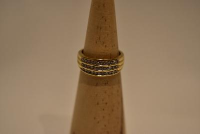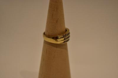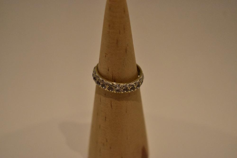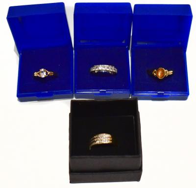 Lot 80 of 616: Four 9ct gold dress rings including an example with central glass stone, size N, also an eternity ring set with glass stones, size M 1/2, combined approx 13.4g.