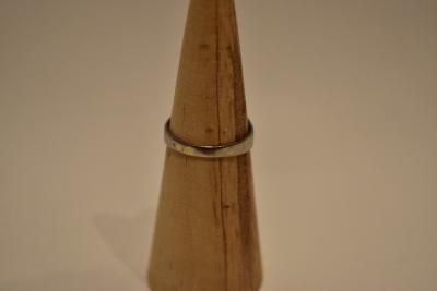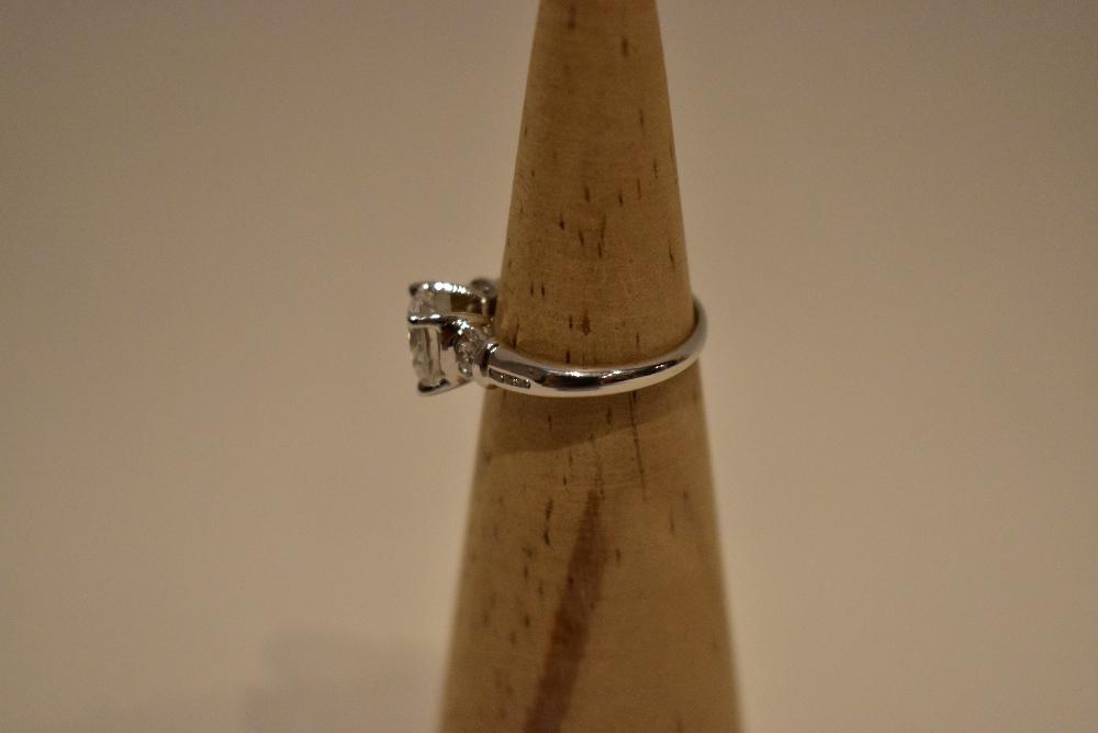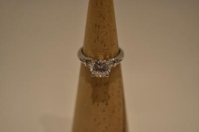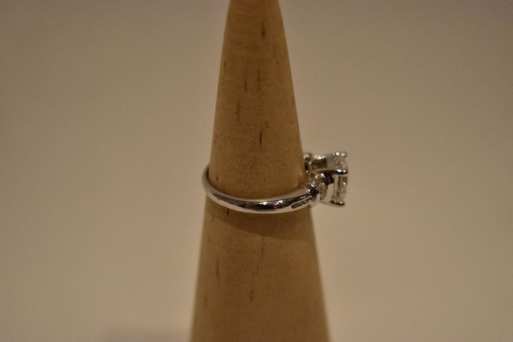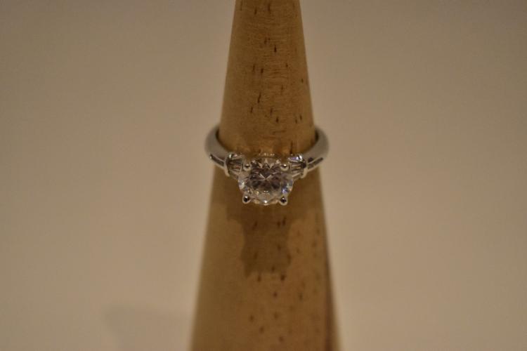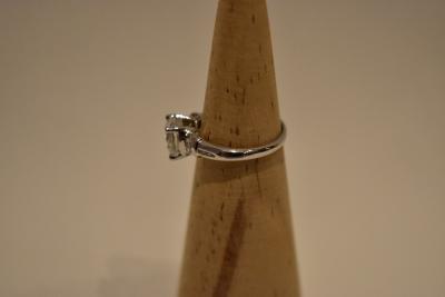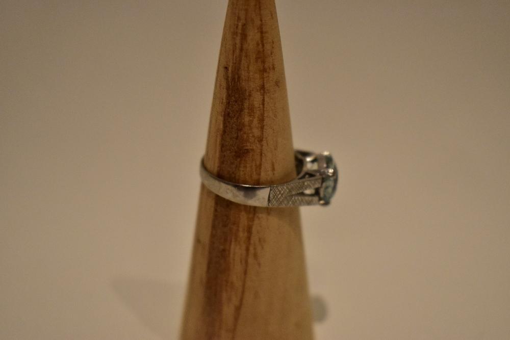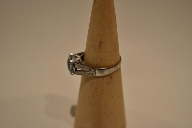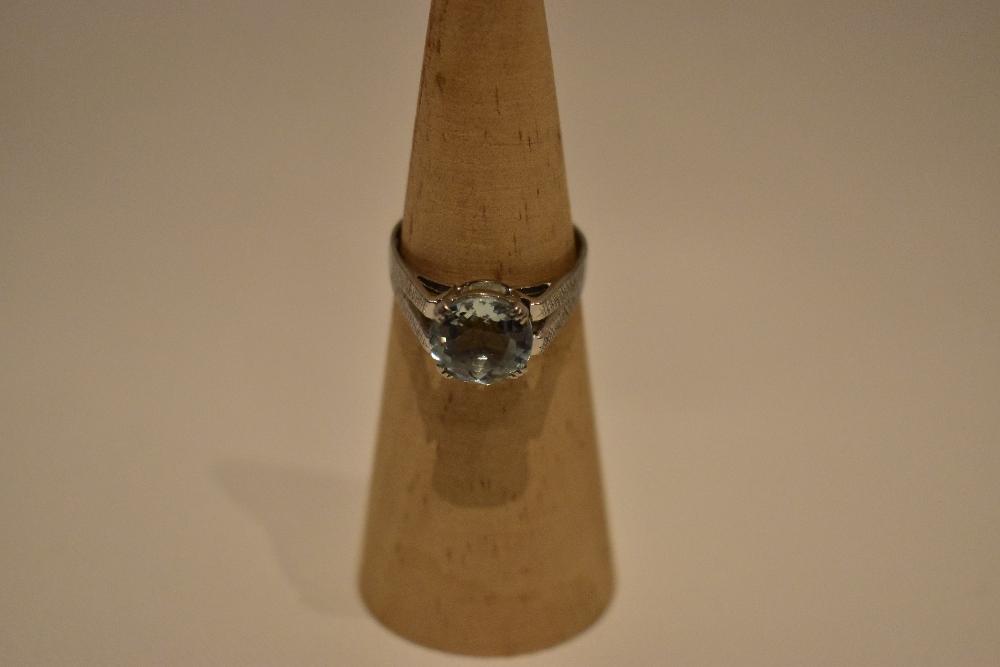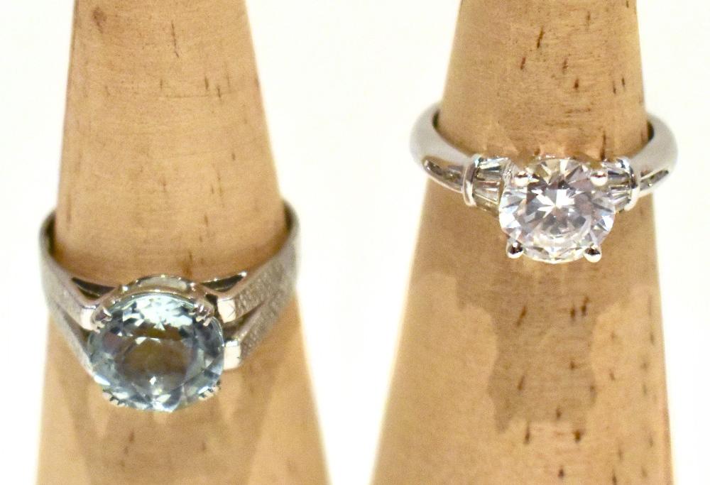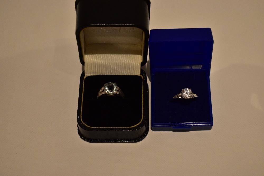 Lot 82 of 616: A white metal solitaire ring set with a pale blue stone, possibly topaz, with textured shoulders, size Q, and a 14ct white gold solitaire ring set with a white stone, size K, combined approx 7.5g (2).