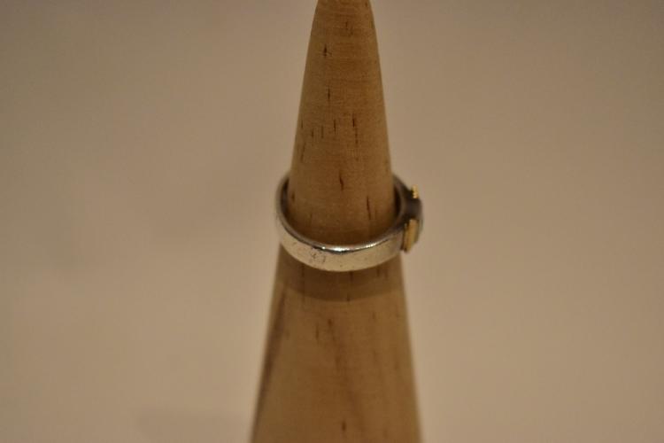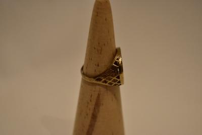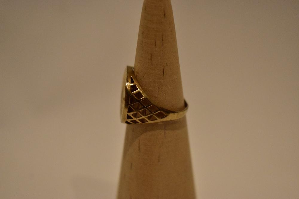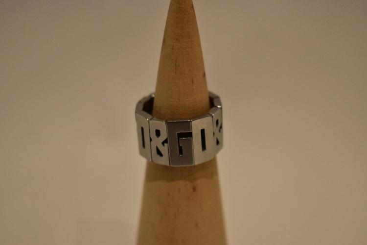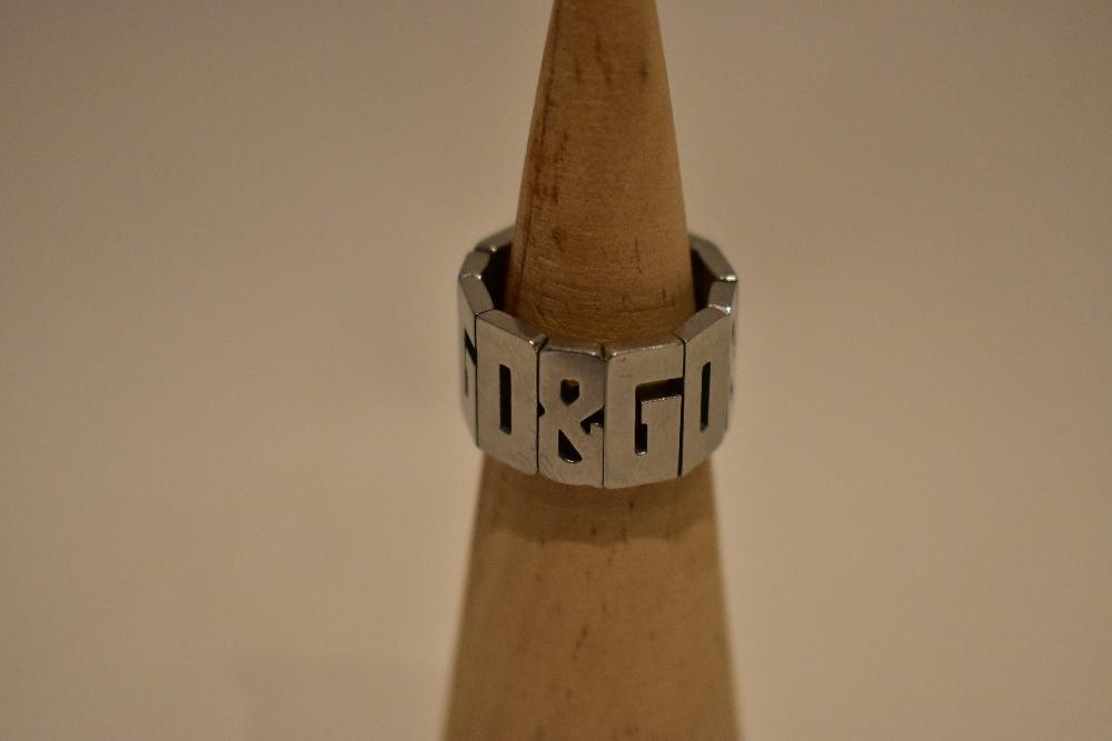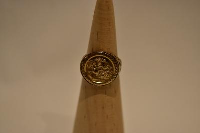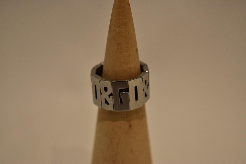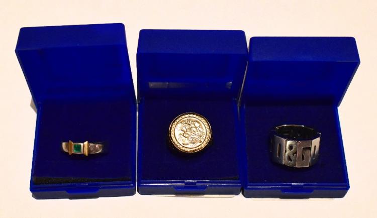Lot 85 of 616: A 9ct yellow gold sovereign style ring with pierced shoulders, dated 1999, size l 1/2, a flexi link Dolce & Gabbana ring and a silver dress ring (3).