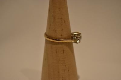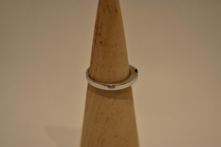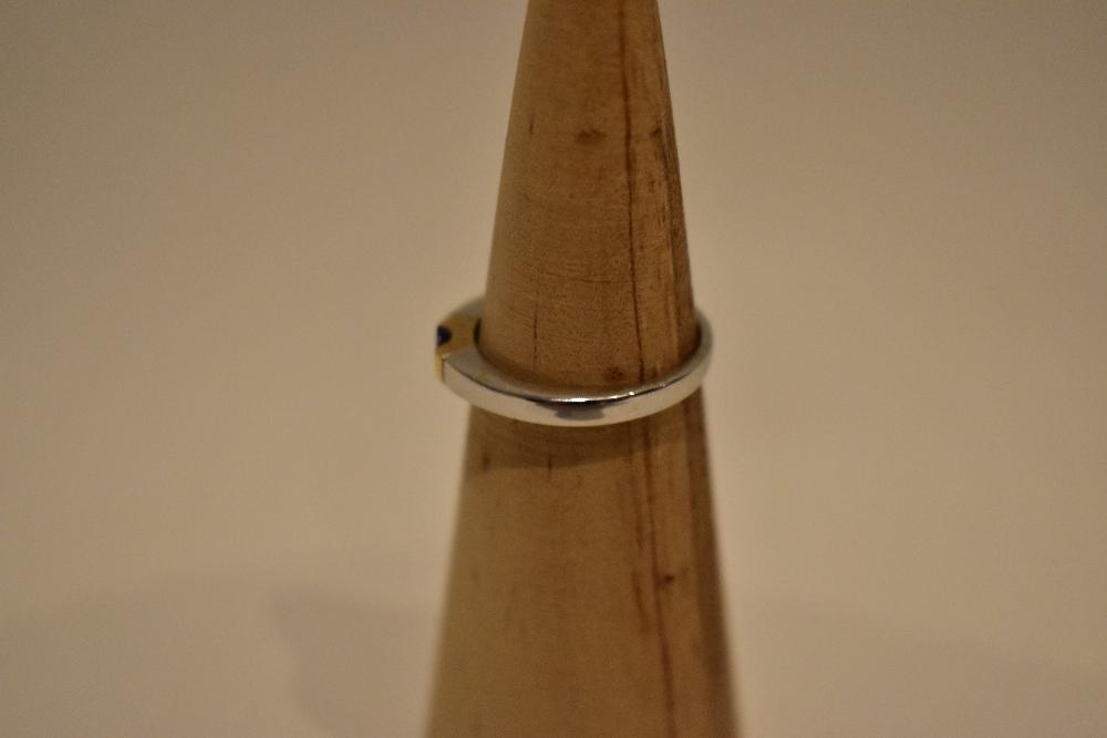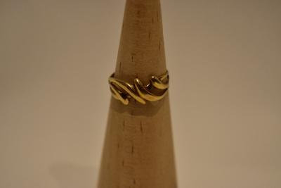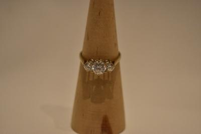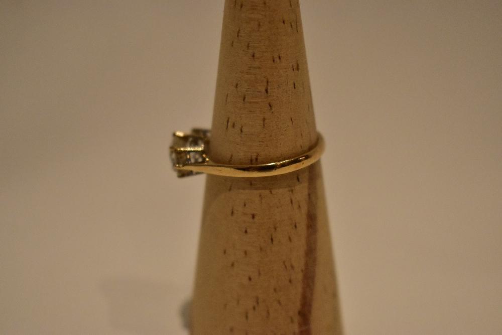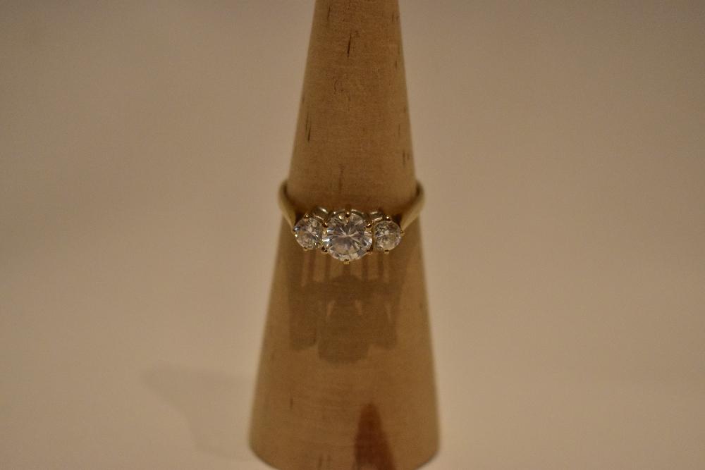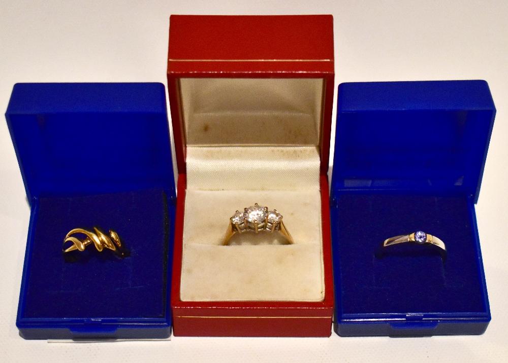 Lot 86 of 616: A 9ct yellow gold dress ring set with three glass stones, size S, a ring stamped 14 and a white metal ring stamped 14K (3).