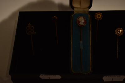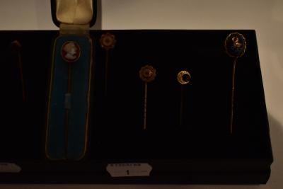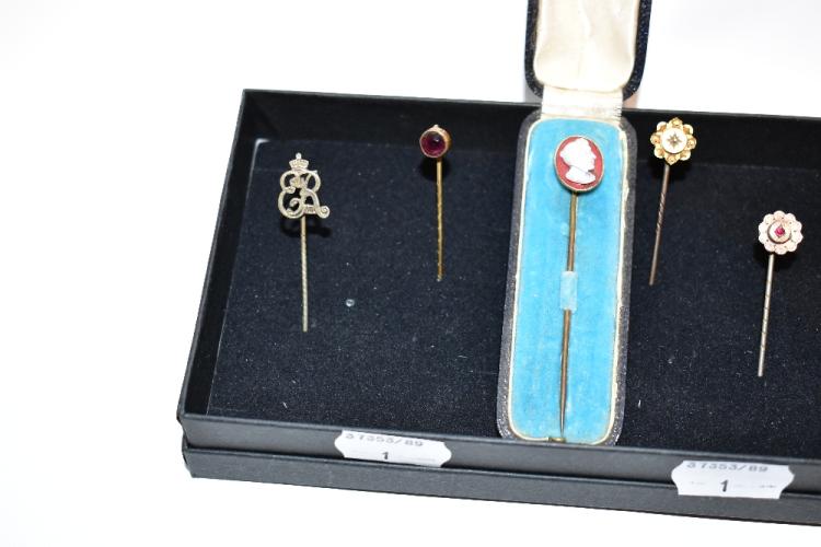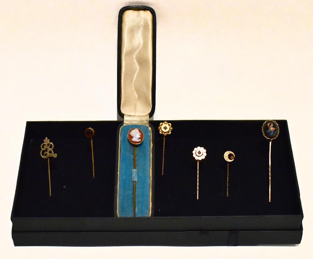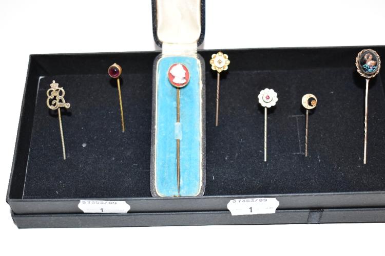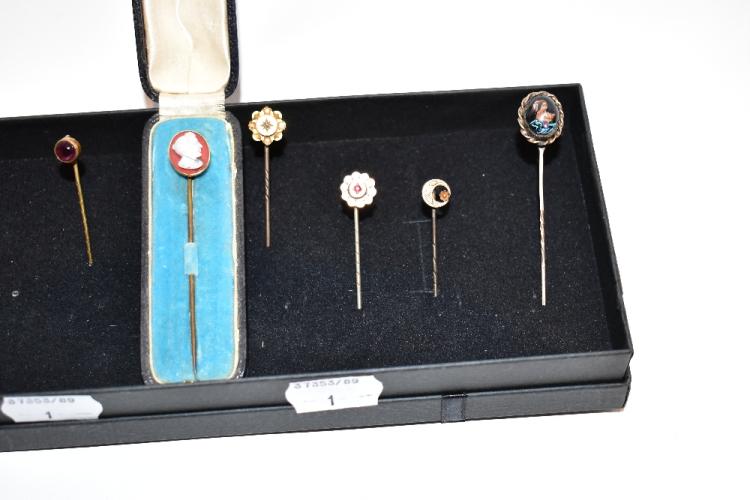 Lot 88 of 616: Seven assorted Victorian and later stick pins including 9ct gold example, and an example with carved cameo panel etc (7).