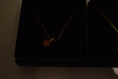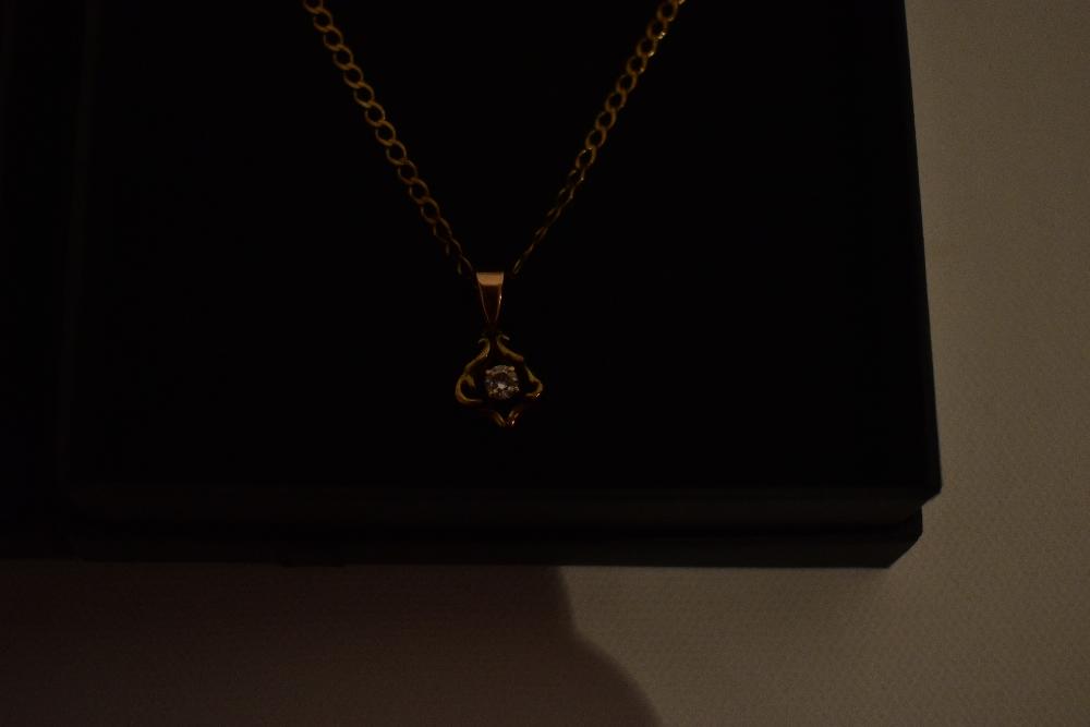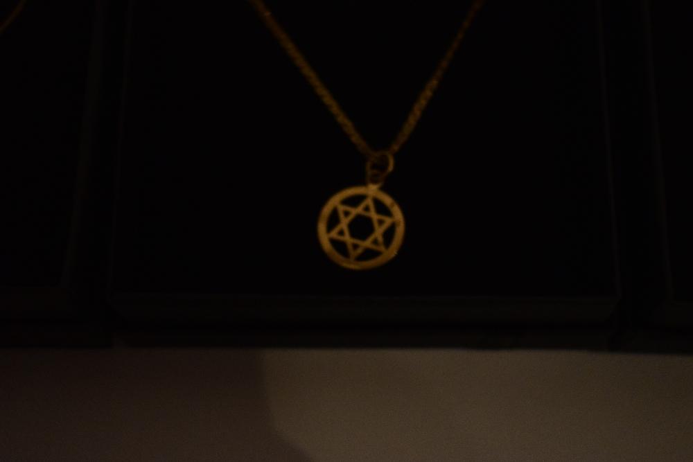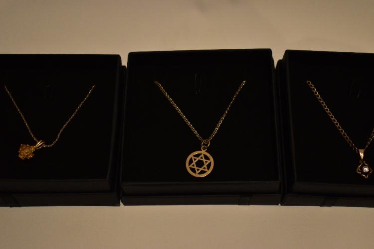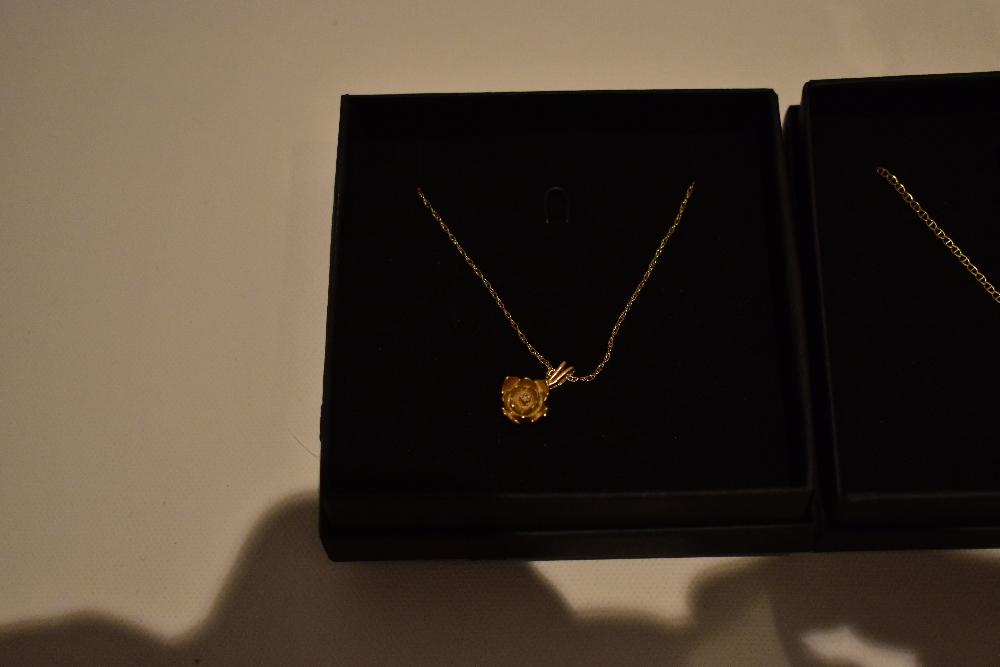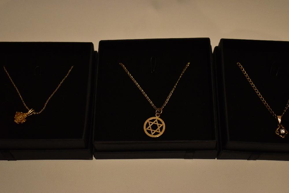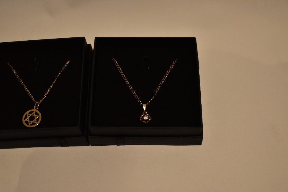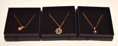 Lot 91 of 616: A yellow metal necklace set with 9ct gold Star of David, the chain stamped 750, a 9ct yellow gold curb link necklace set with yellow metal pendant with glass stone and a yellow metal necklace with pendant. stamped 585, combined approx 10.1g (3).