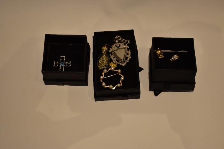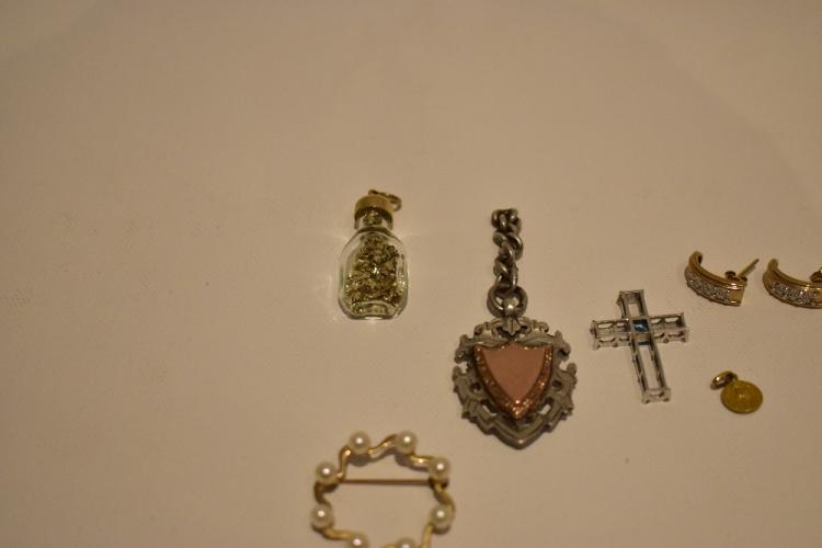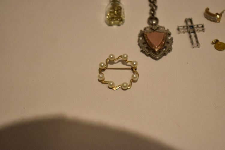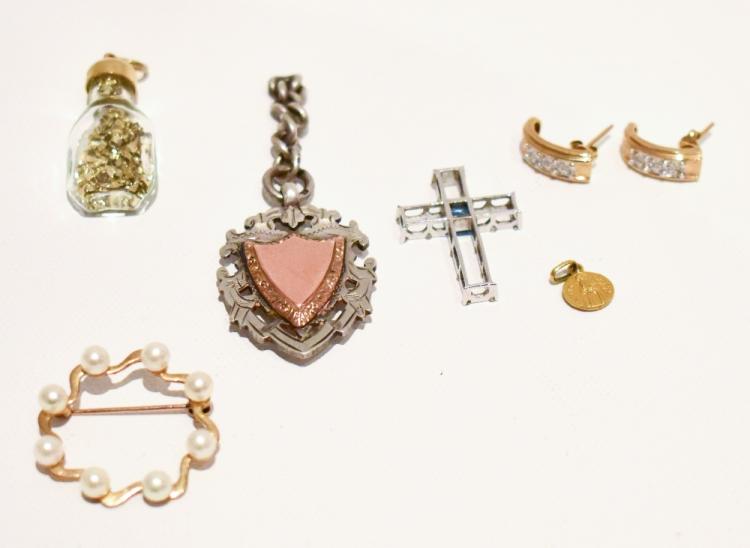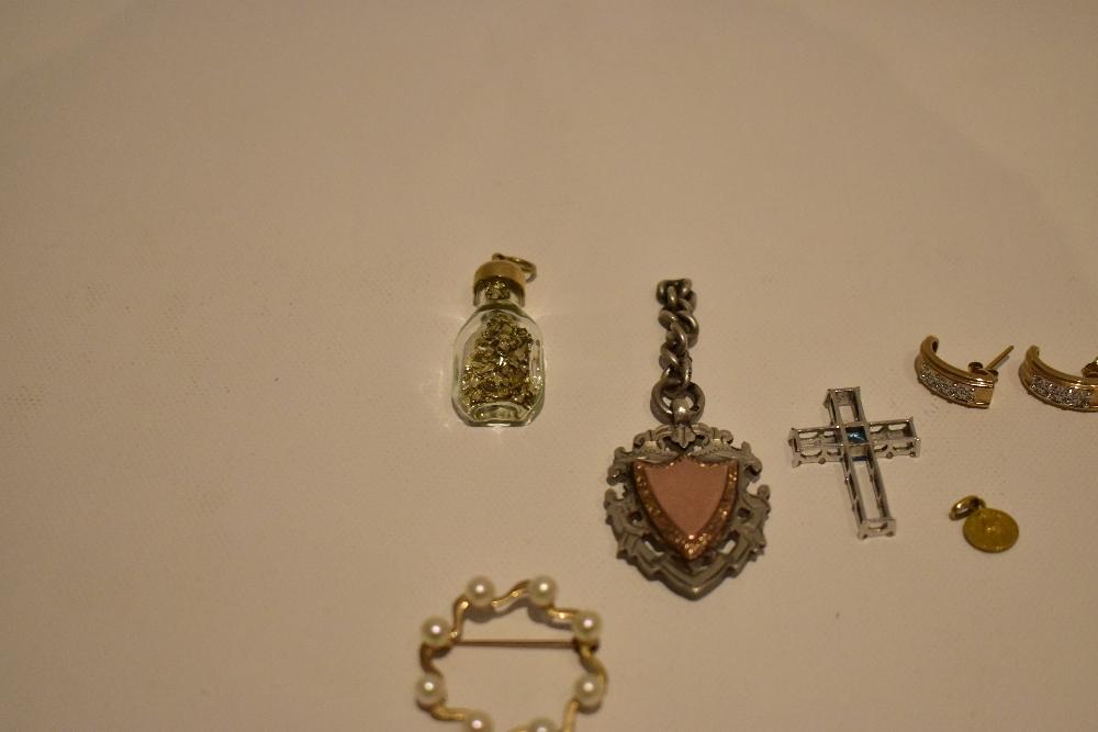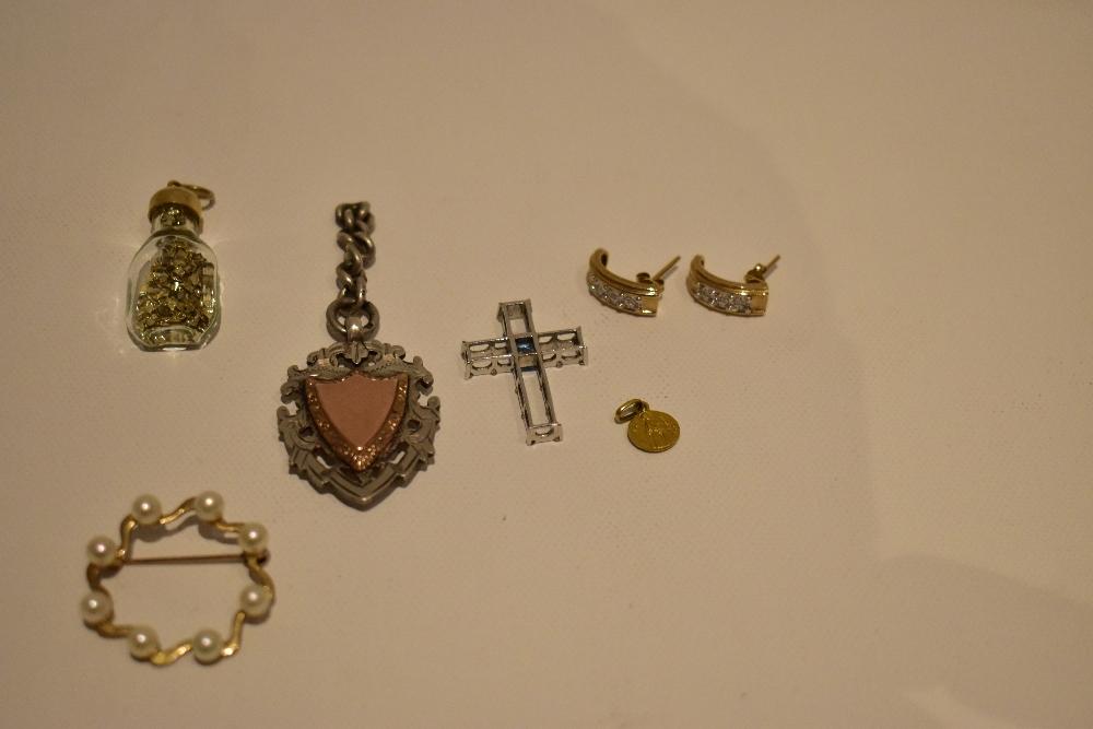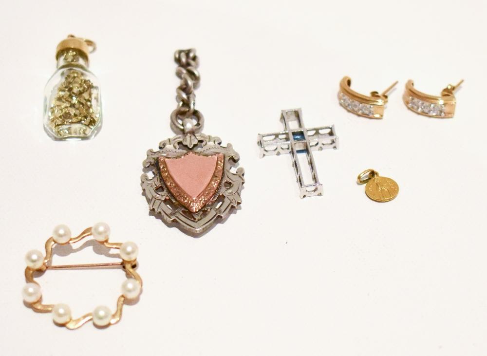 Lot 92 of 616: A pair of 9ct yellow gold hoop shaped earrings set with glass stones, a white metal crucifix, a 9ct yellow gold and seed pearl brooch of circular form, hallmarked silver fob, and a yellow metal St Francis pendant.