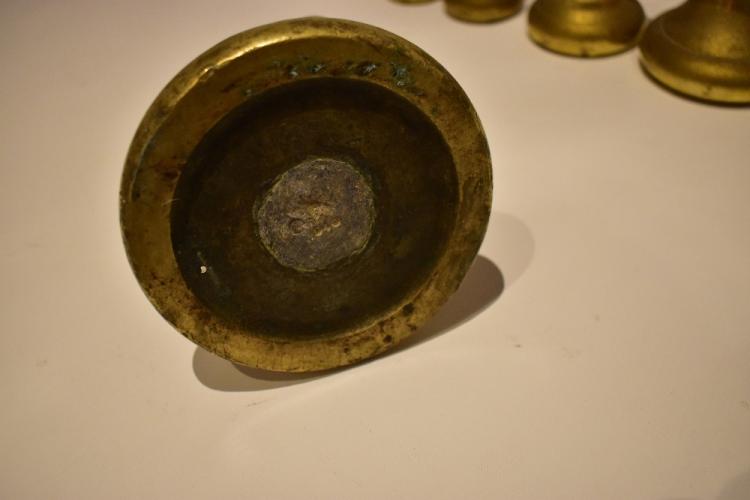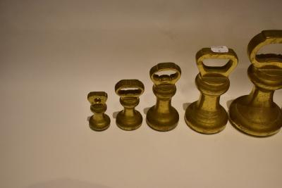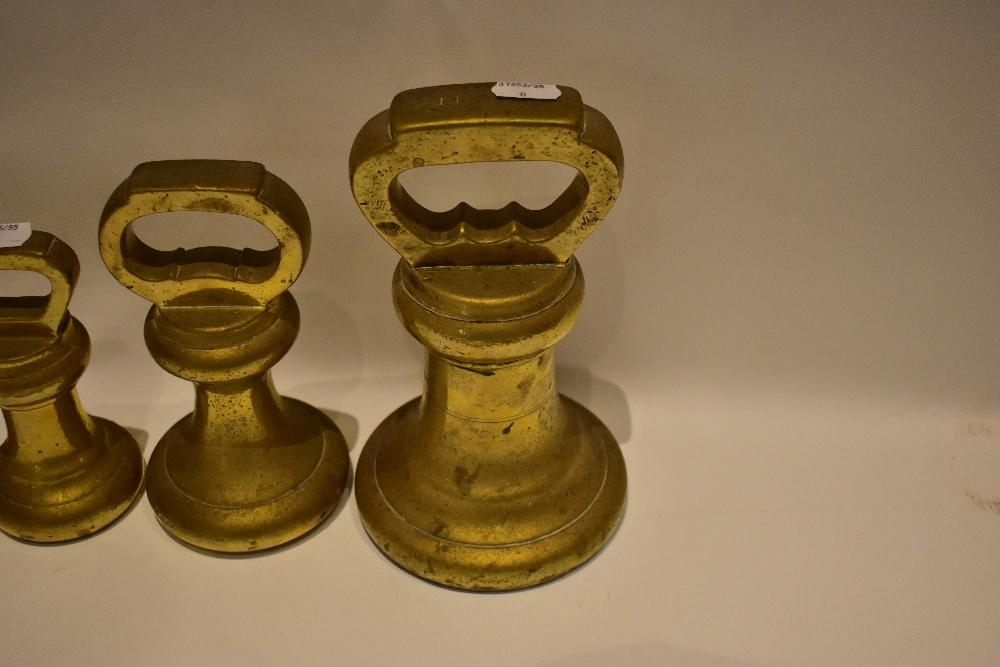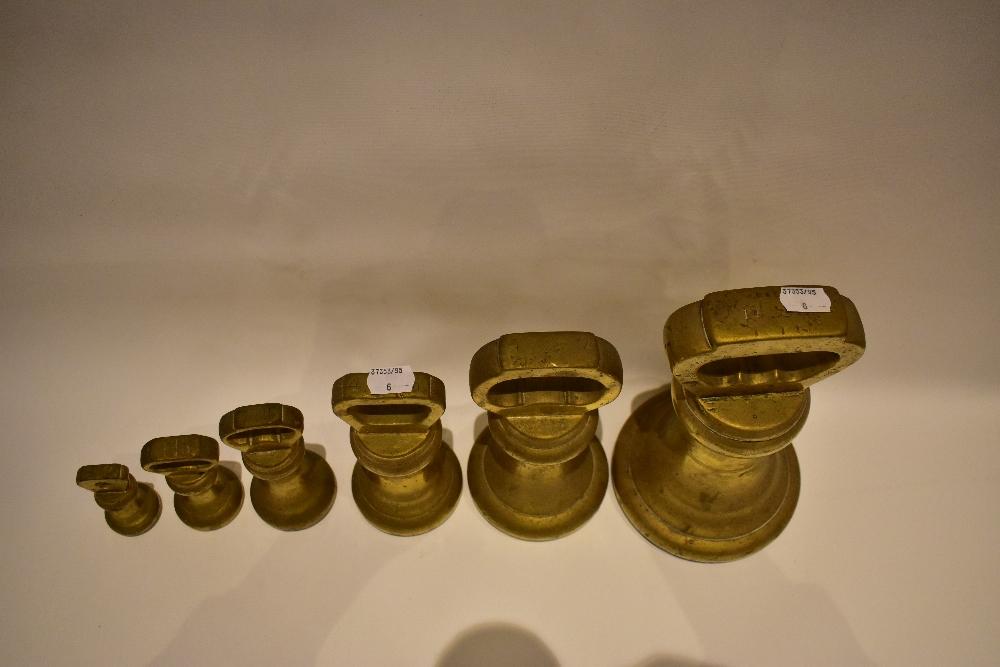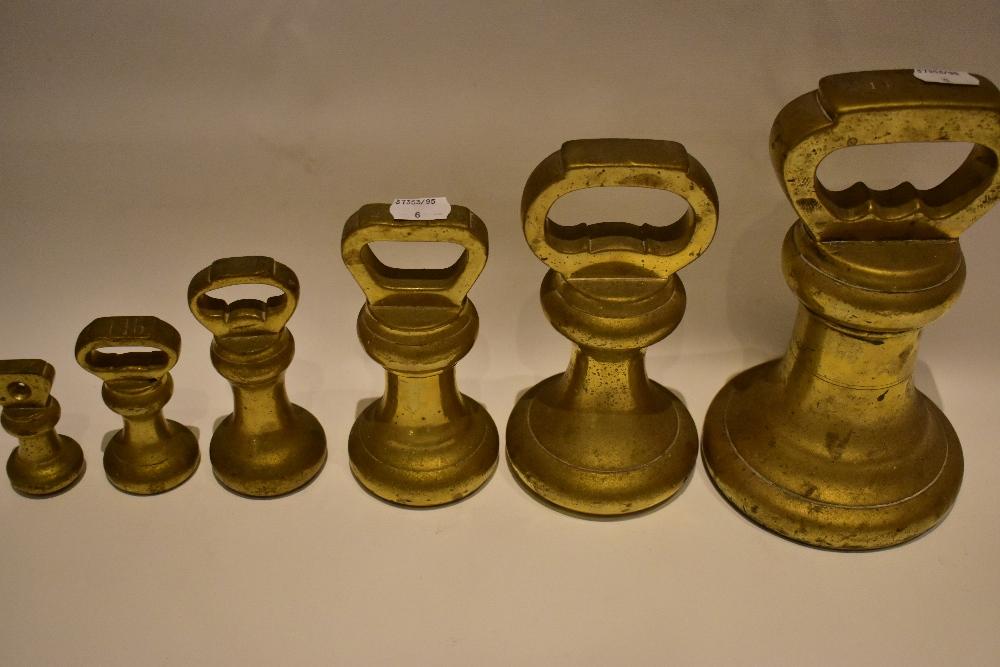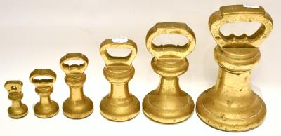 Lot 94 of 616: A harlequin set of six brass bell weights, the majority with original pewter inserts, largest example 14lb (6).