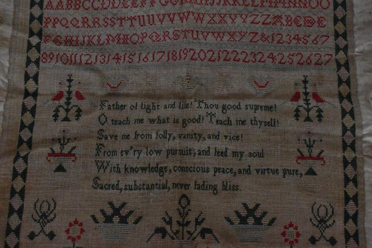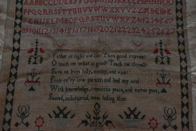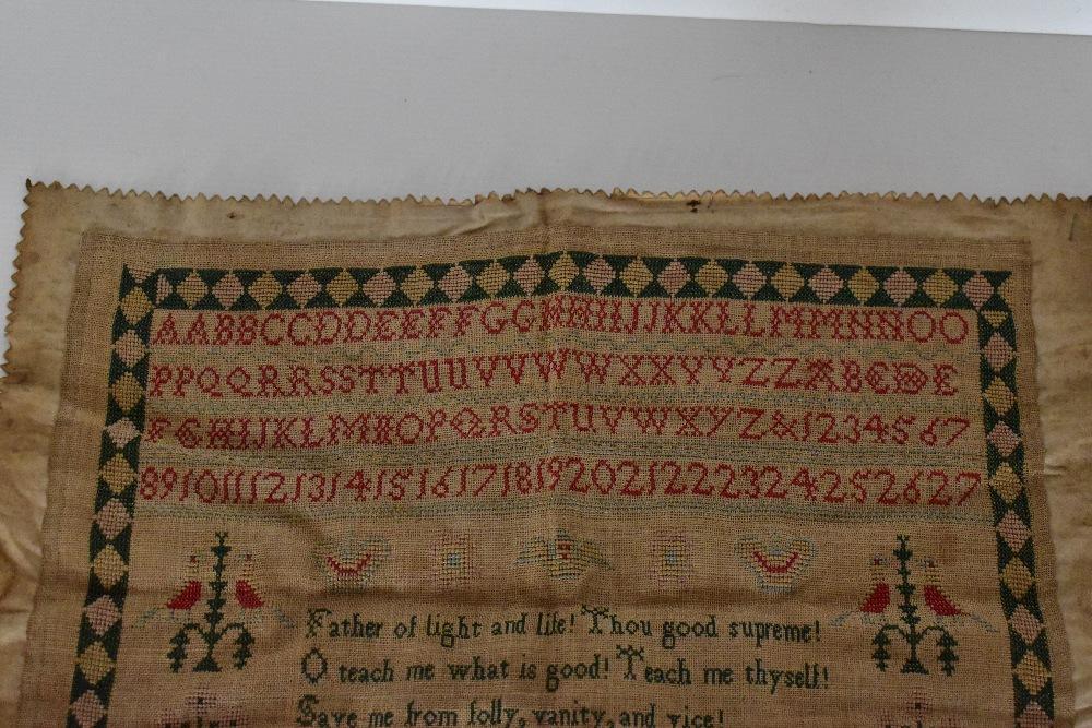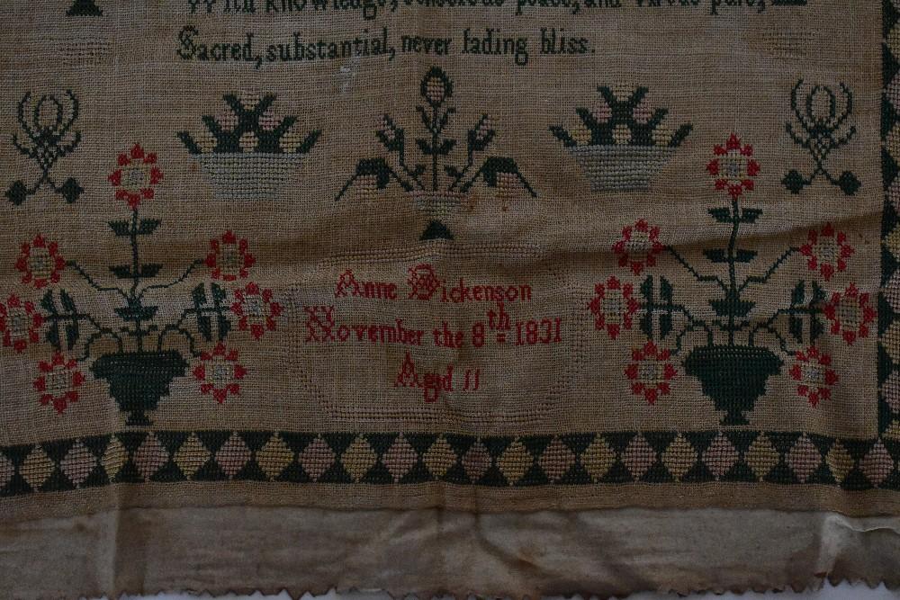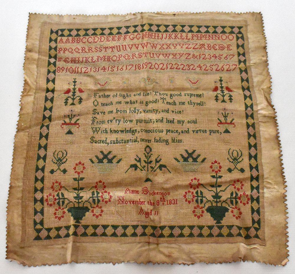 Lot 97 of 616: A 19th century needlework sampler by Anne Dickinson November 8th 1831 aged 11, backed on material cloth, 45 x 42cm.