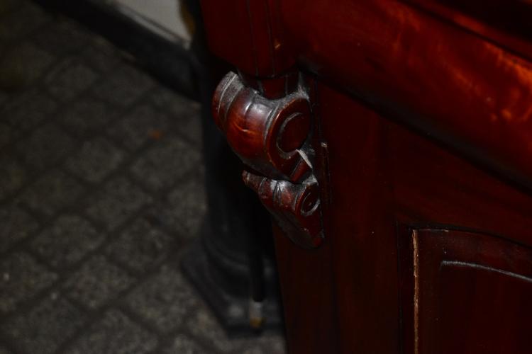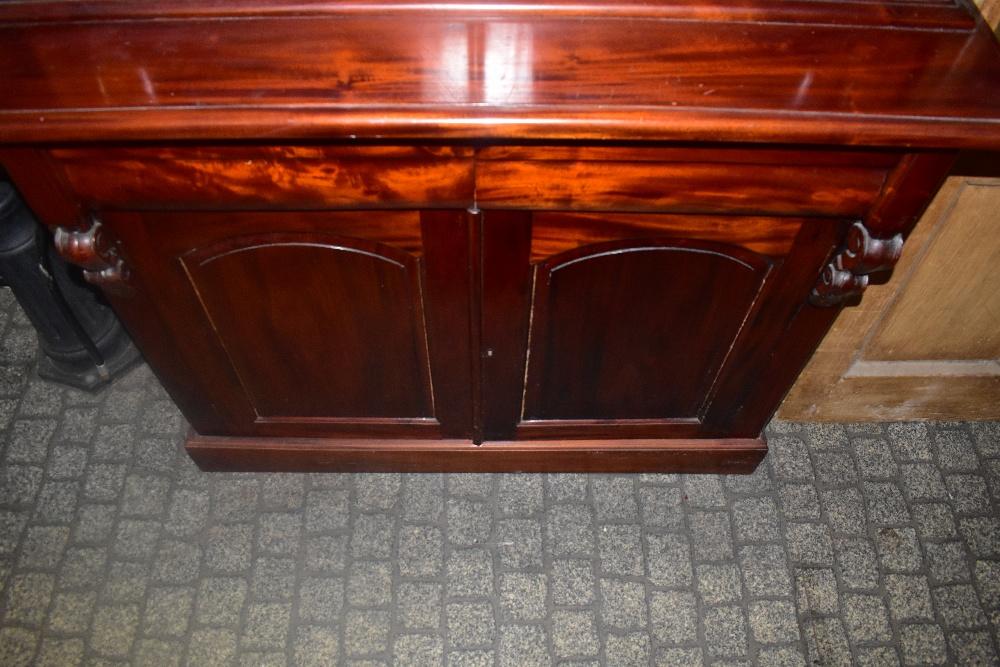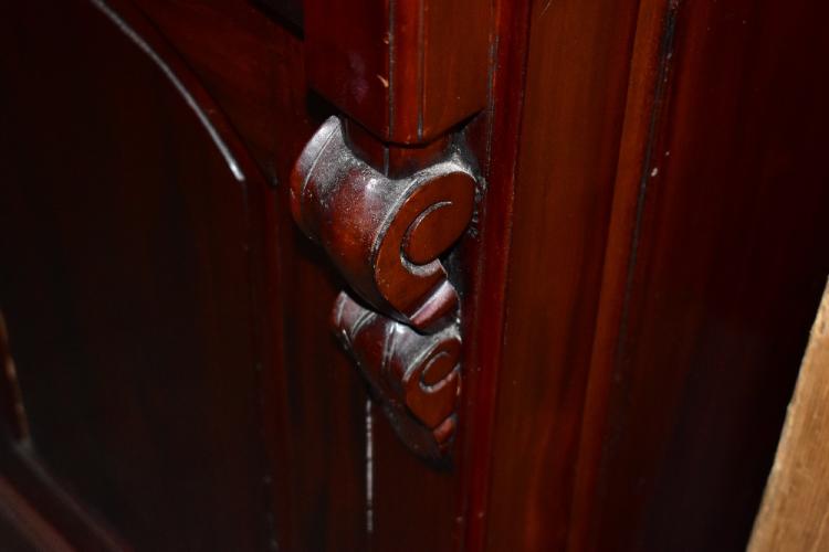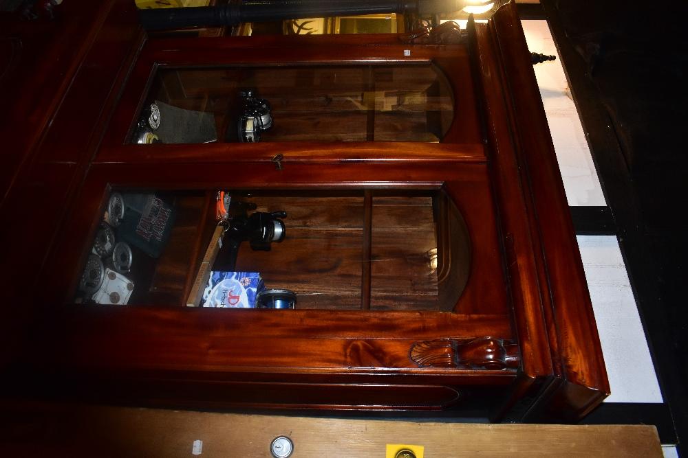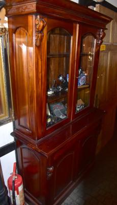 Lot 98 of 616: A reproduction Victorian style mahogany bookcase, the upper section with a pair of glazed doors enclosing two shelves, the bottom section with two secret drawers above two panelled cupboard doors on plinth base, width 115cm, depth 49cm, height 205cm.