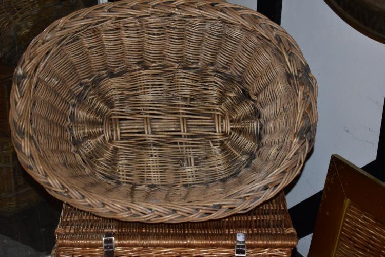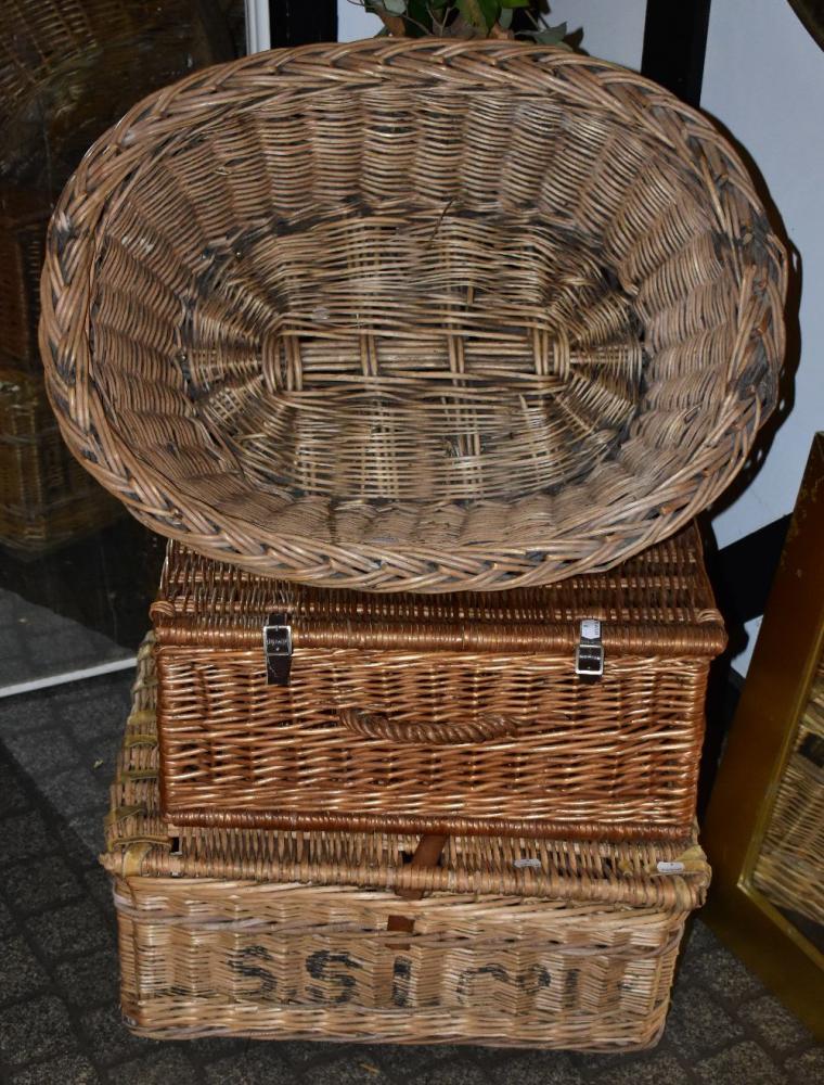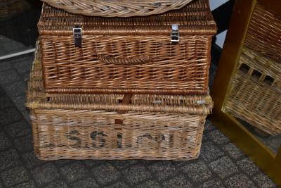 Lot 100 of 616: Two wicker picnic baskets (lacking contents), a wicker laundry basket and a wicker planter, containing a faux tree.